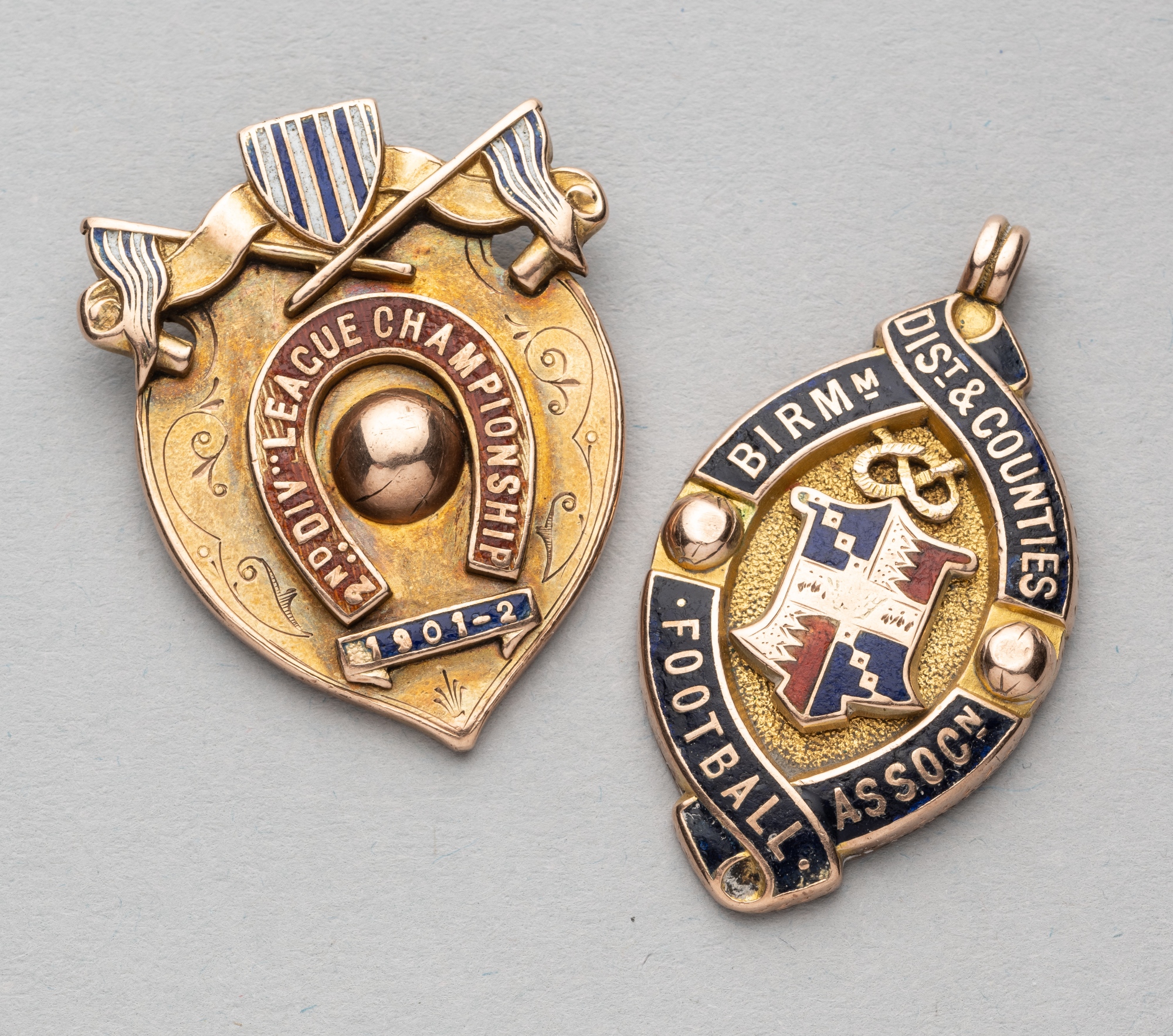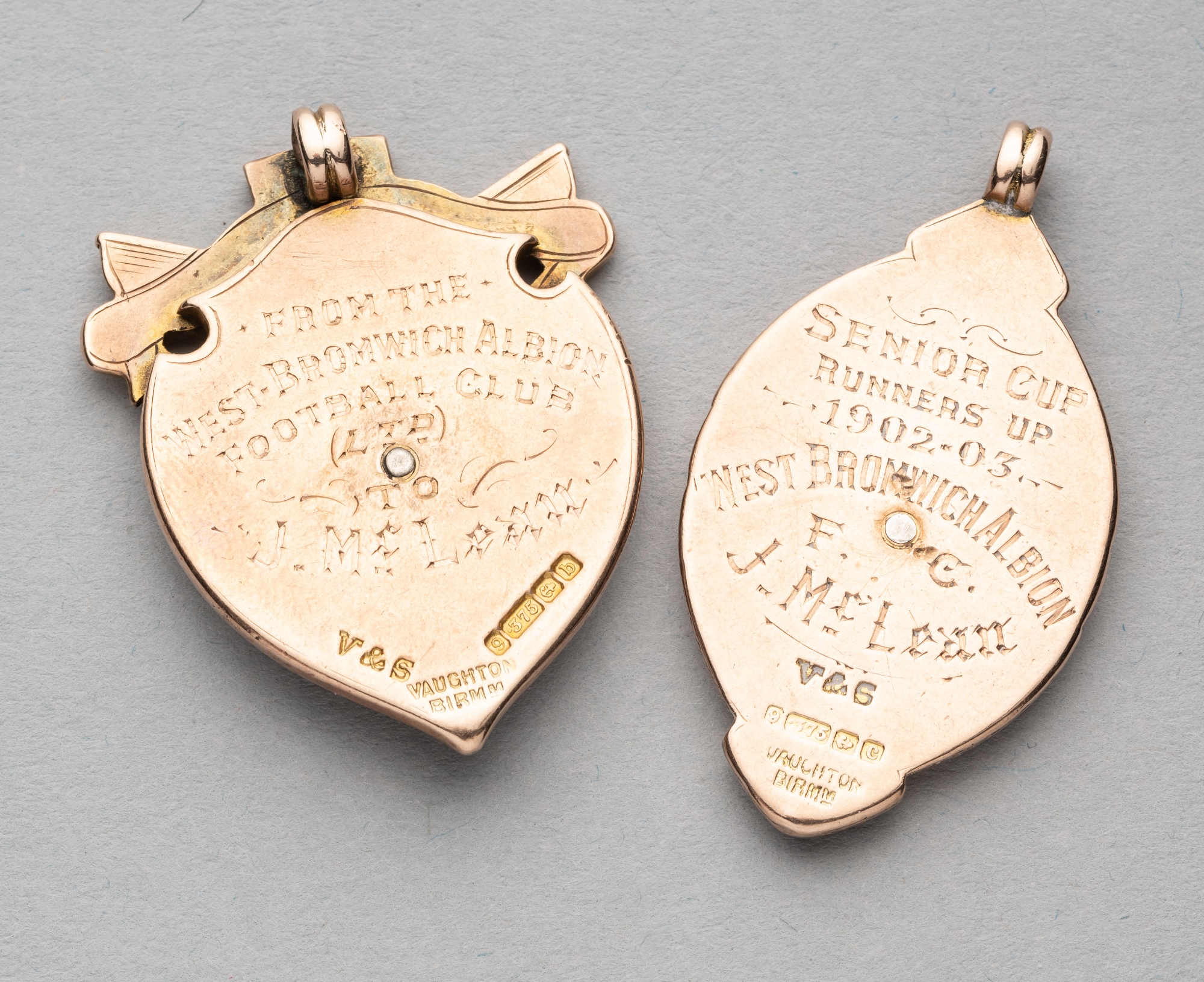 Two West Bromwich Albion medals awarded to Jimmy McLean, comprising Second Division League Championship 1901-02 medal, obverse with enamelled shield and flags above a football surrounded by 2ND DIVISION CHAMPIONSHIP 1901-2, reverse engraved FROM THE WEST BROMWICH ALBION FOOTBALL CLUB J. McLEAN, 9ct gold Birmingham 1901 by Vaughton & Sons, 36 by 30mm.; and a Birmingham District and Counties FA Senior Cup runners-up medal 1902-03, obverse with enamelled decoration, reverse engraved SENIOR CUP RUNNERS-UP 1902-03 WEST BROMWICH ALBION F.C. J. McLEAN, 9ct gold Birmingham 1902 by Vaughton & Sons, 40 by 26cm., total weight 36gms., some enamel loss and wear to engraving to each medal, (2)