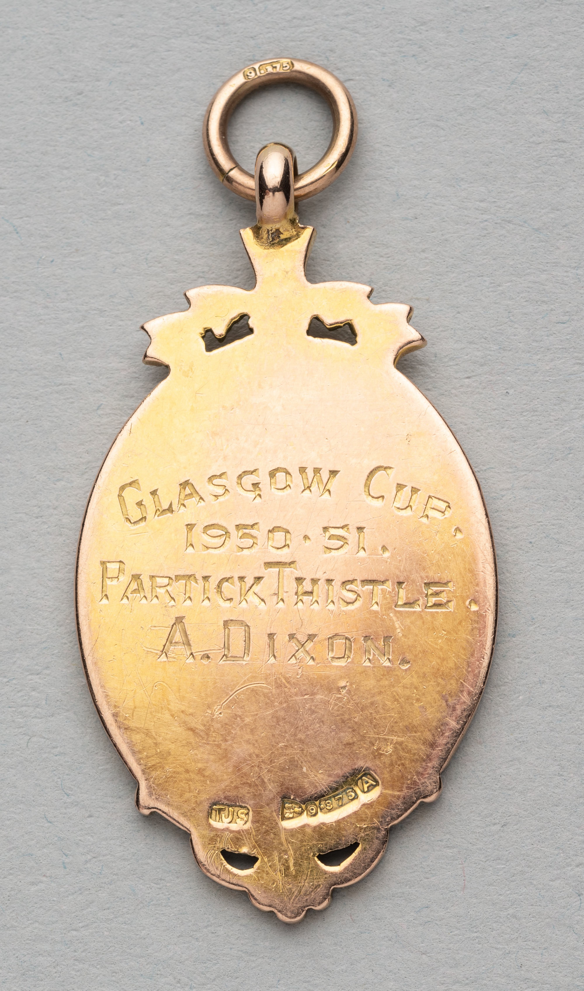 Glasgow Cup winner's medal awarded to Partick Thistle's A. Dixon, 1950-51, obverse with applied crest, reverse engraved GLASGOW CUP 1950-51 PARTICK THISTLE A. DIXON, 9ct gold Birmingham 1950 by Thomas James Skelton, oval with suspension ring, 9ct gold Chester 1951 by Thomas James Skelton, 41 by 22mm., weight 9gms. Partick Thistle defeated Celtic 3-2 in the replay at Hampden Park, 26th March 1951.