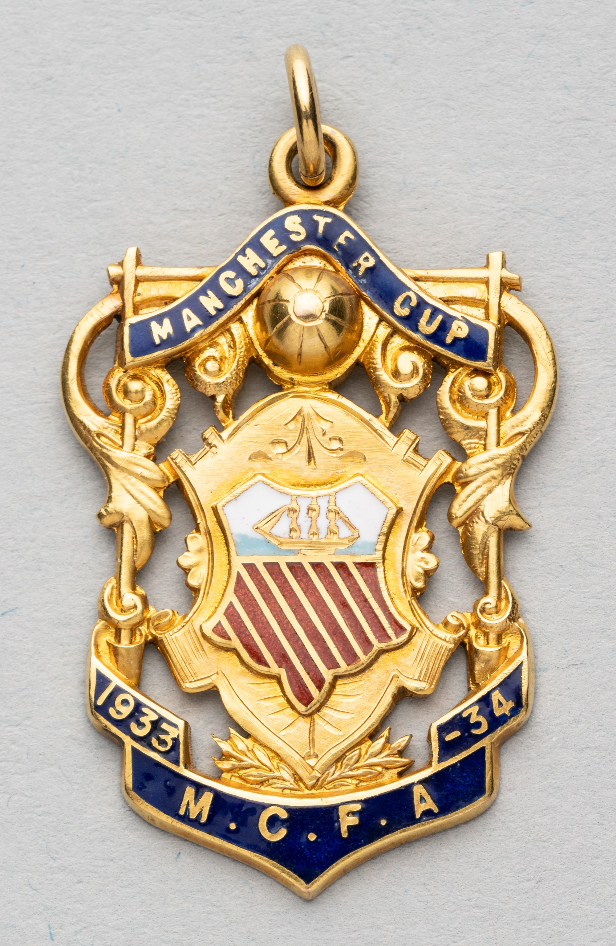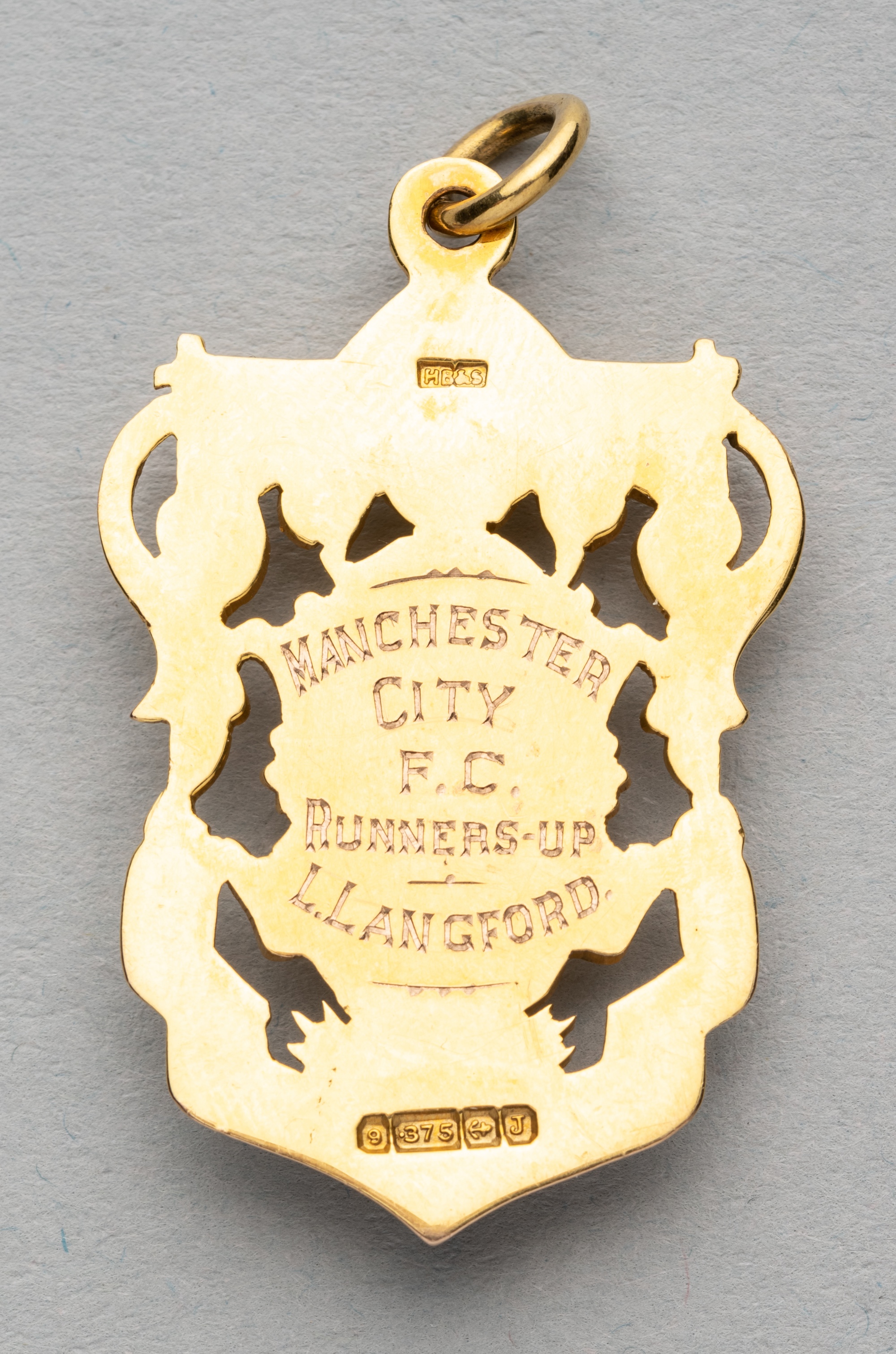 Manchester Senior Cup runners-up medal awarded to Manchester City's L. Langford, 1933-34, obverse with enamelled shield and lettering MANCHESTER CUP 1933-34 M.C.F.A., reverse engraved MANCHESTER CITY F.C. RUNNERS-UP L. LANGFORD, shield shaped with suspension ring, 9ct gold, Birmingham 1933 by Herbert Bushell & Son Ltd, weight 7gms., 34 by 23mm., minor enamel loss to obverse