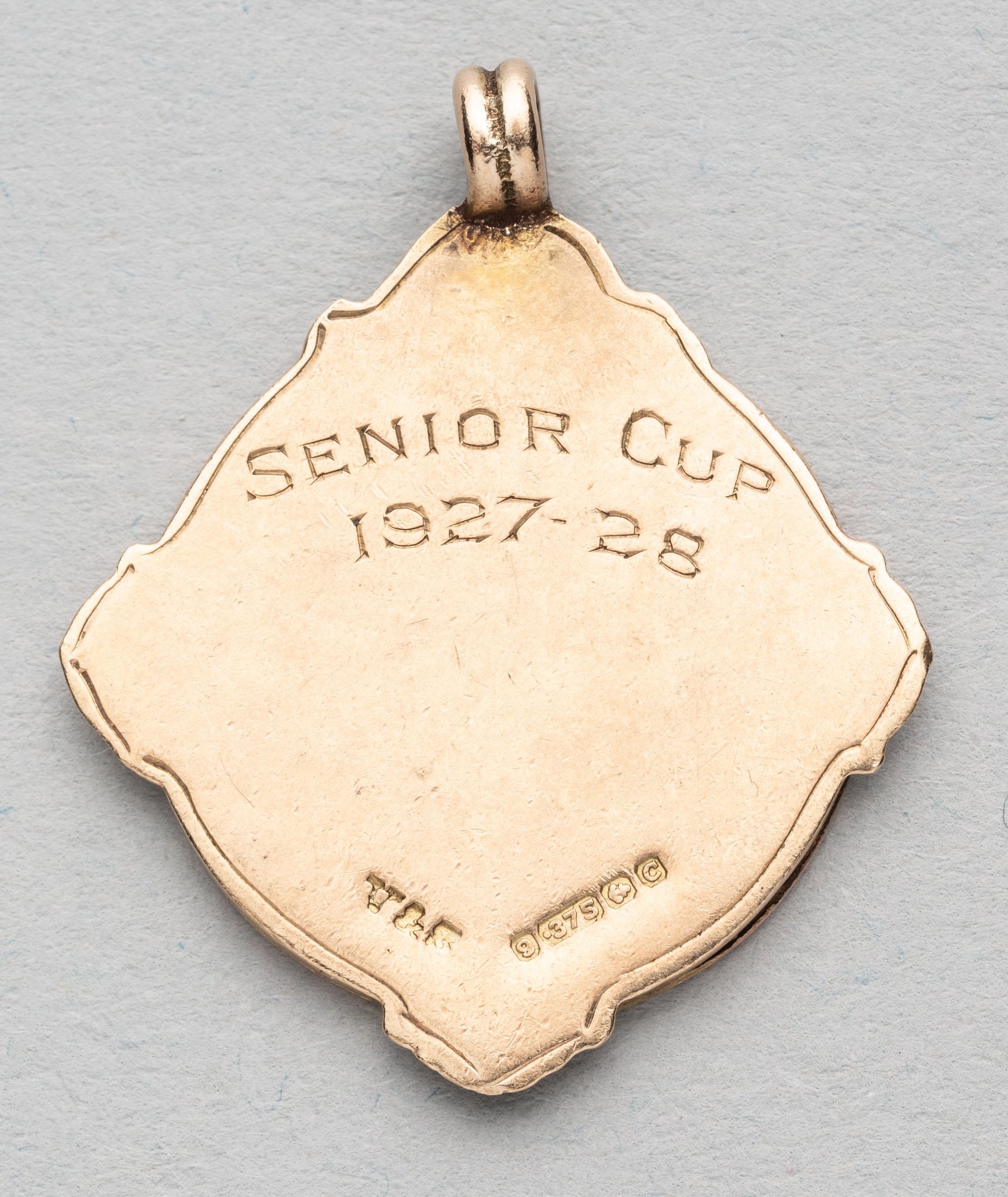 Suffolk County Football Association Senior Cup winner's medal awarded to an Ipswich Town player, 1927-28, obverse enamelled with county crest and lettering, reverse engraved SENIOR CUP 1927-28, circular lobed with suspension ring, 9ct gold Birmingham 1927 by Vaughton & Sons, weight 6gms., 30 by 25mm., bears minor wear to enamelled obverse