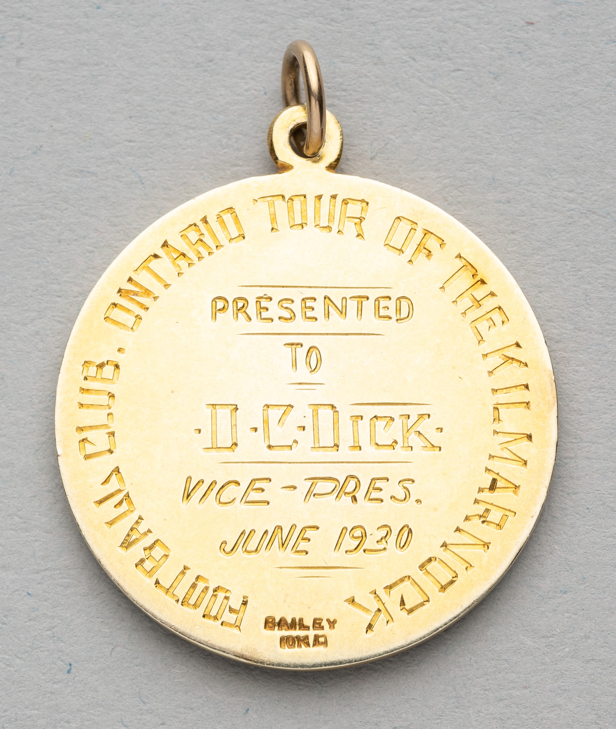 Ontario Football Association medal awarded to Kilmarnock Vice President D.C. Dick for the Canadian tour in June 1930, obverse with ONTARIO FOOTBALL ASSCIATION surrounding city crest in relief, reverse engraved FOOTBALL CLUB ONTARIO TOUR OF THE KILMARNICK, PRESENTED TO D.C. DICK VICE-PRES. JUNE 1930, circular with suspension ring, stamped 10k Bailey, weight 17gms. diameter 29mm.