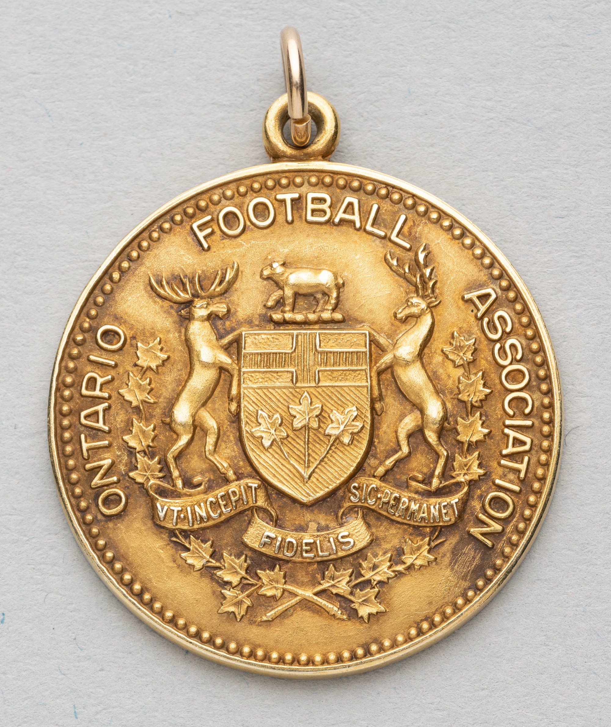 Ontario Football Association medal awarded to Kilmarnock Vice President D.C. Dick for the Canadian tour in June 1930, obverse with ONTARIO FOOTBALL A