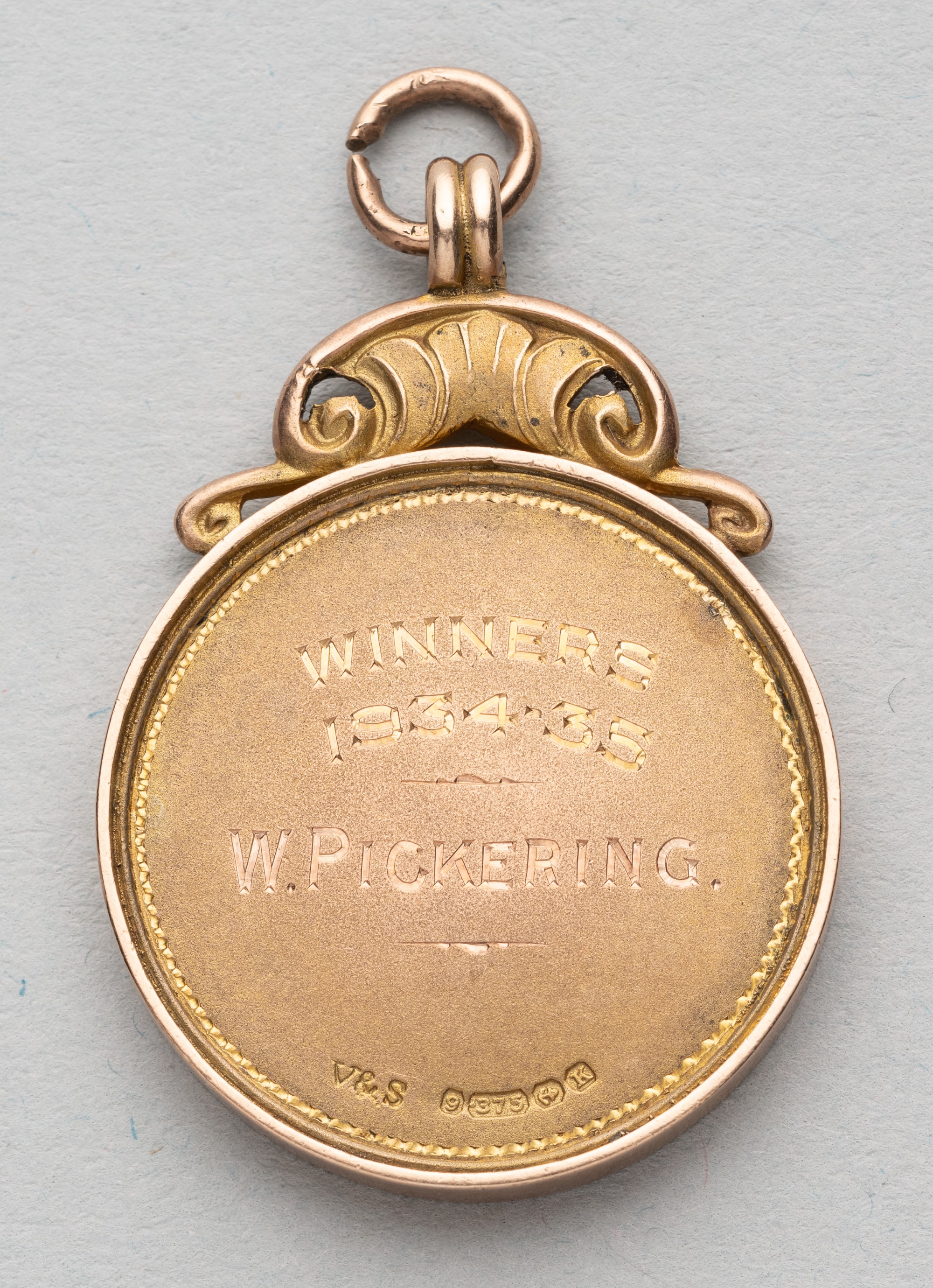 Football League Division Three Southern Section Cup winner's medal awarded to Bristol Rovers' W. Pickering, 1934-35, obverse enamelled with crests and lettering, reverse engraved WINNERS 1934-35 W. PICKERING, circular with suspension ring, 9ct gold Birmingham 1934 by Vaughton & Sons, weight 13gms., diameter 28mm.