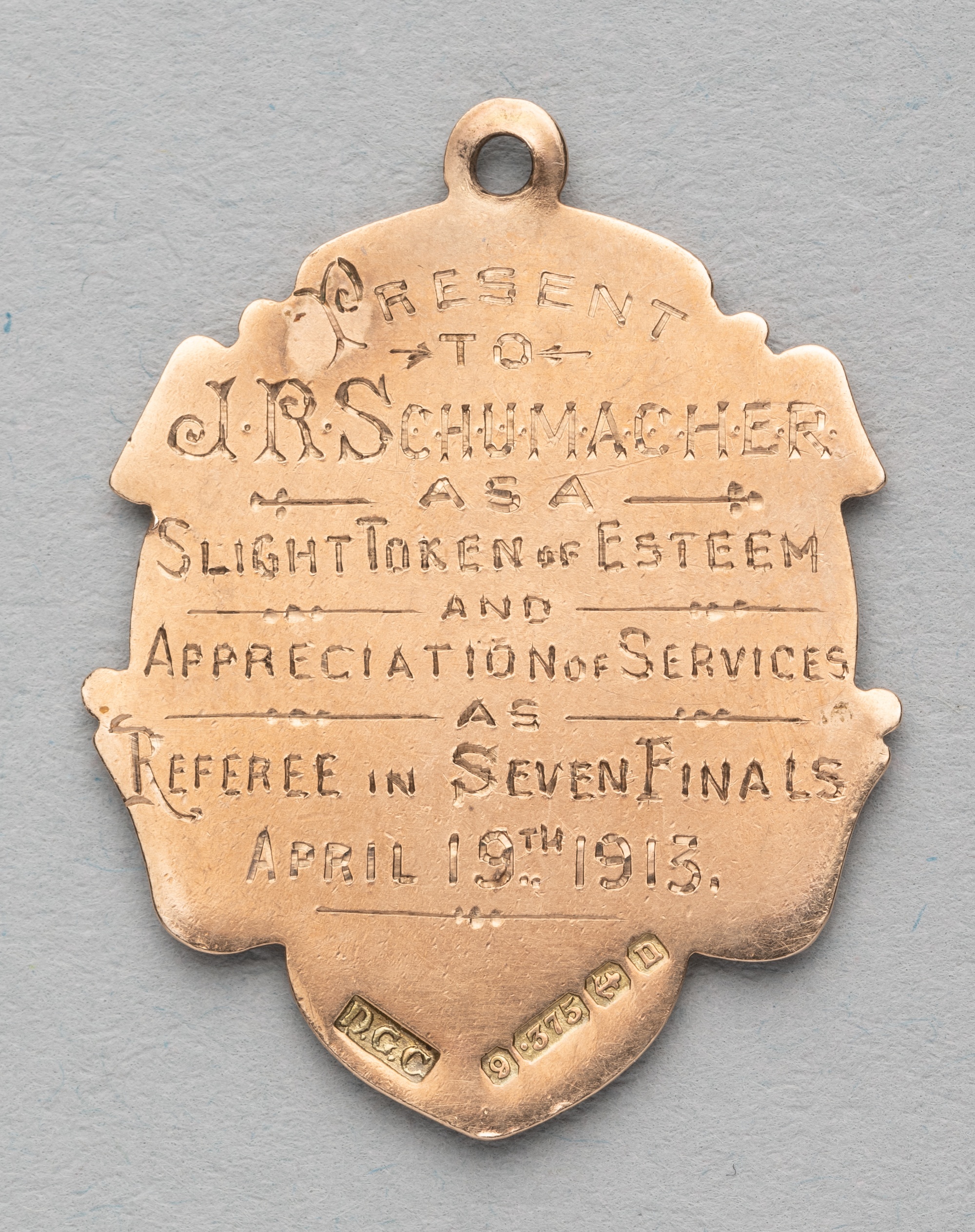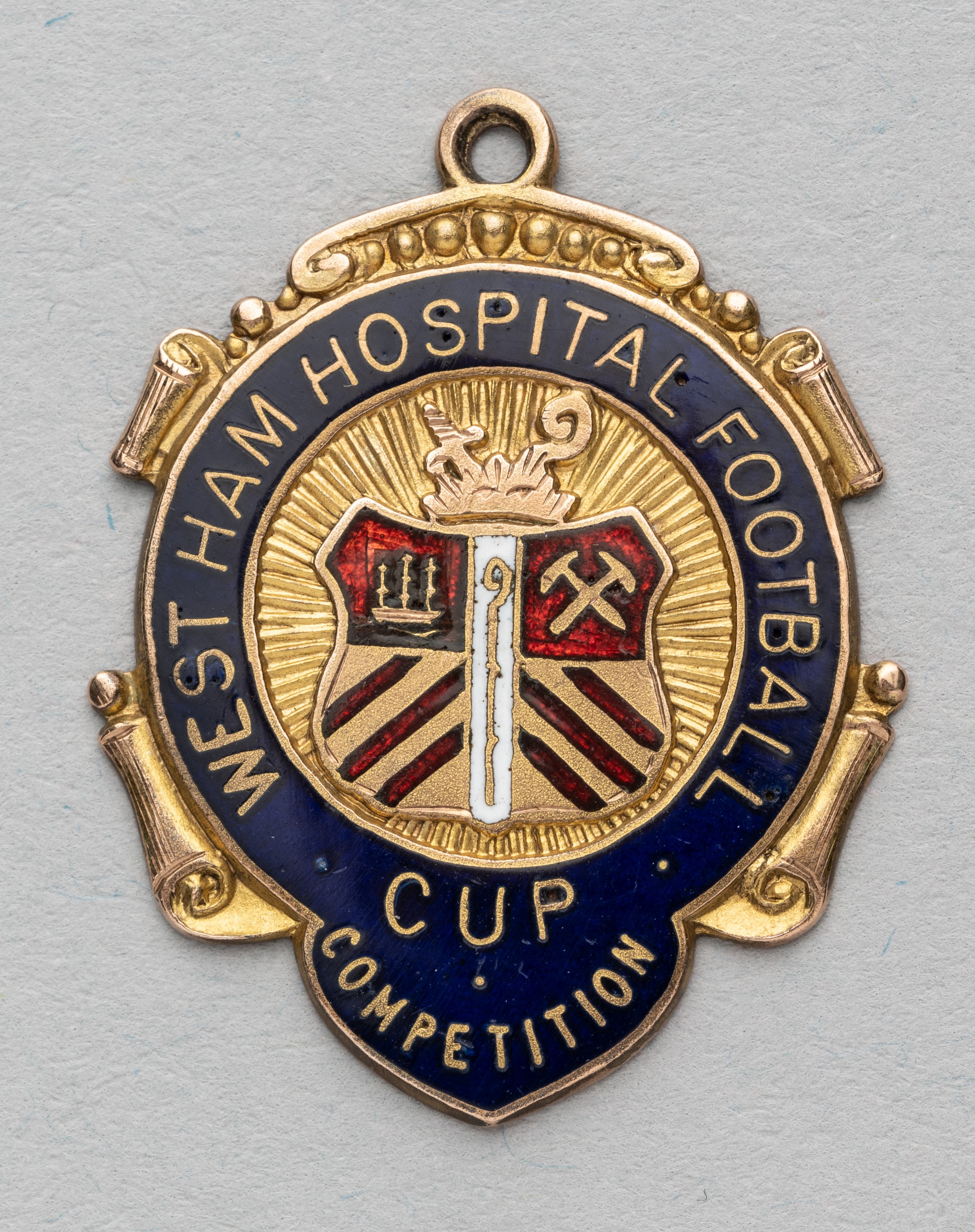 West Ham Hospital Football Cup competition medal awarded to referee J.R. Schumacher, 19th April 1913, obverse with enamelled shield crest and lettering, reverse engraved PRESENT TO J.R. SCHUMACKER AS A SLIGHT TOKEN OF ESTEEM AND APPRECIATION OF SERVICES AS REFEREE IN SEVEN FINALS APRIL 19TH 1913, oblong shaped with suspension ring, 9ct gold Birmingham 1912 by Daniel George Collins, weight 6gms., 31 by 25mm., minor wear to enamel obverse, some pitting to enamel