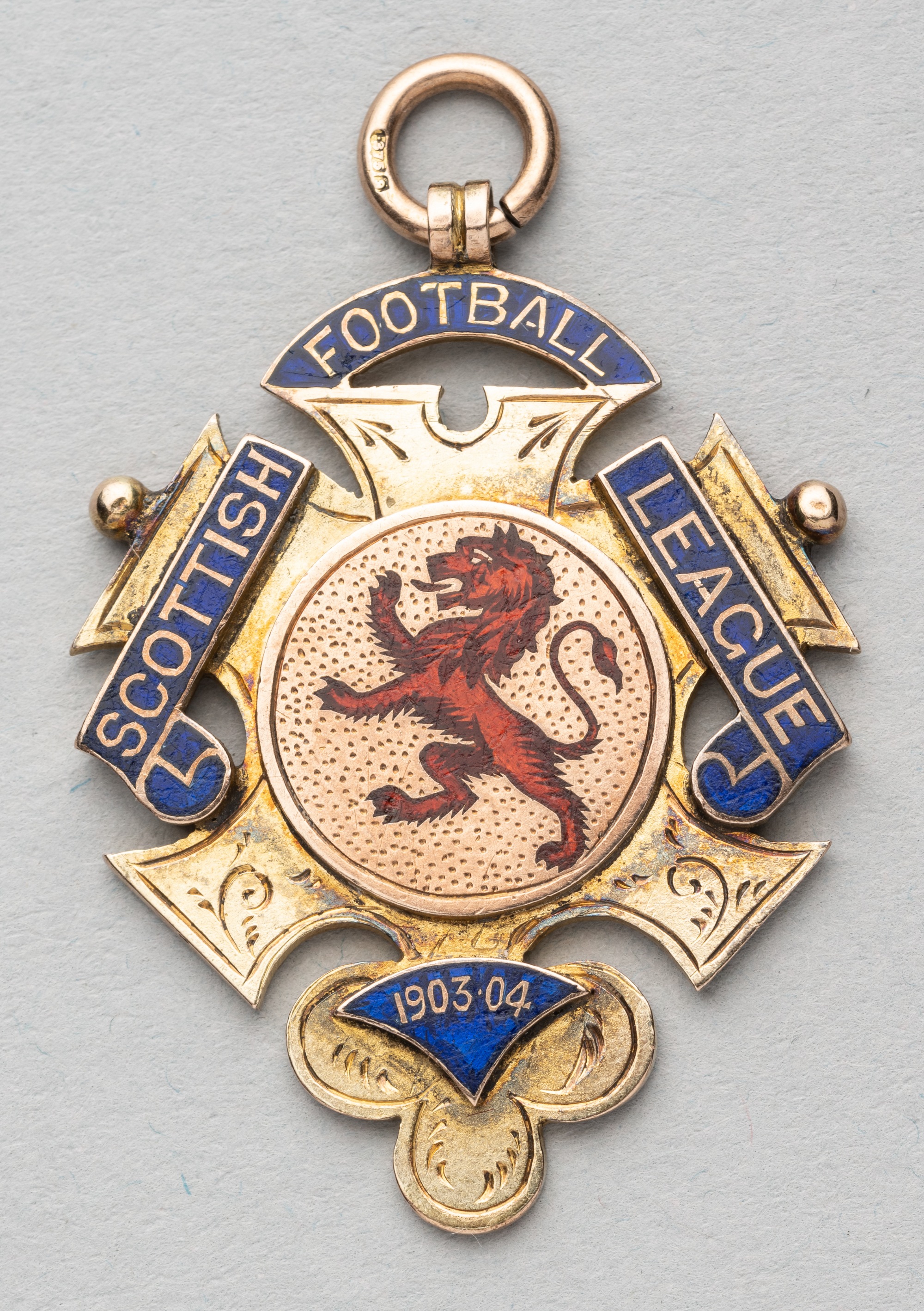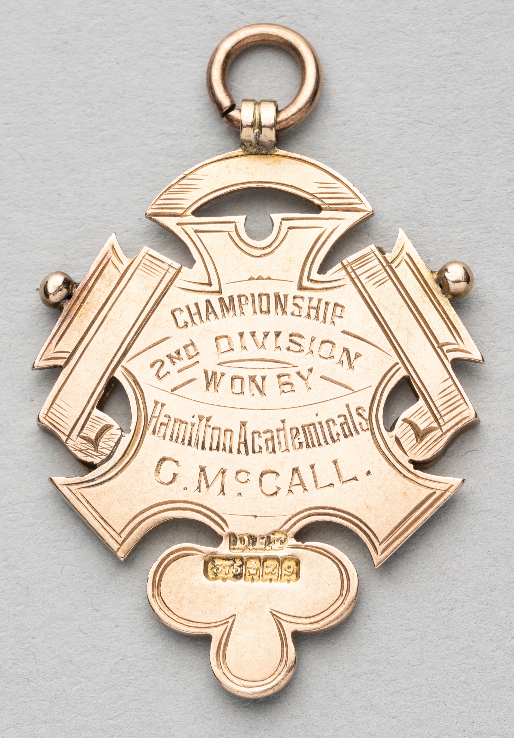 Scottish Football League second division championship winner's medal awarded to Hamilton Academical's G. McCall, 1903-04, obverse with red enamelled lion rampant and blue enamelled lettering, reverse engraved CHAMPIONSHIP 2ND DIVISION WON BY HAMILTON ACADEMICALS G. McCALL, shaped medal with suspension ring, 9ct gold Glasgow 1904 by David F Turnbull, weight 11gms., 40 by 28mm., minor wear to enamelled area's