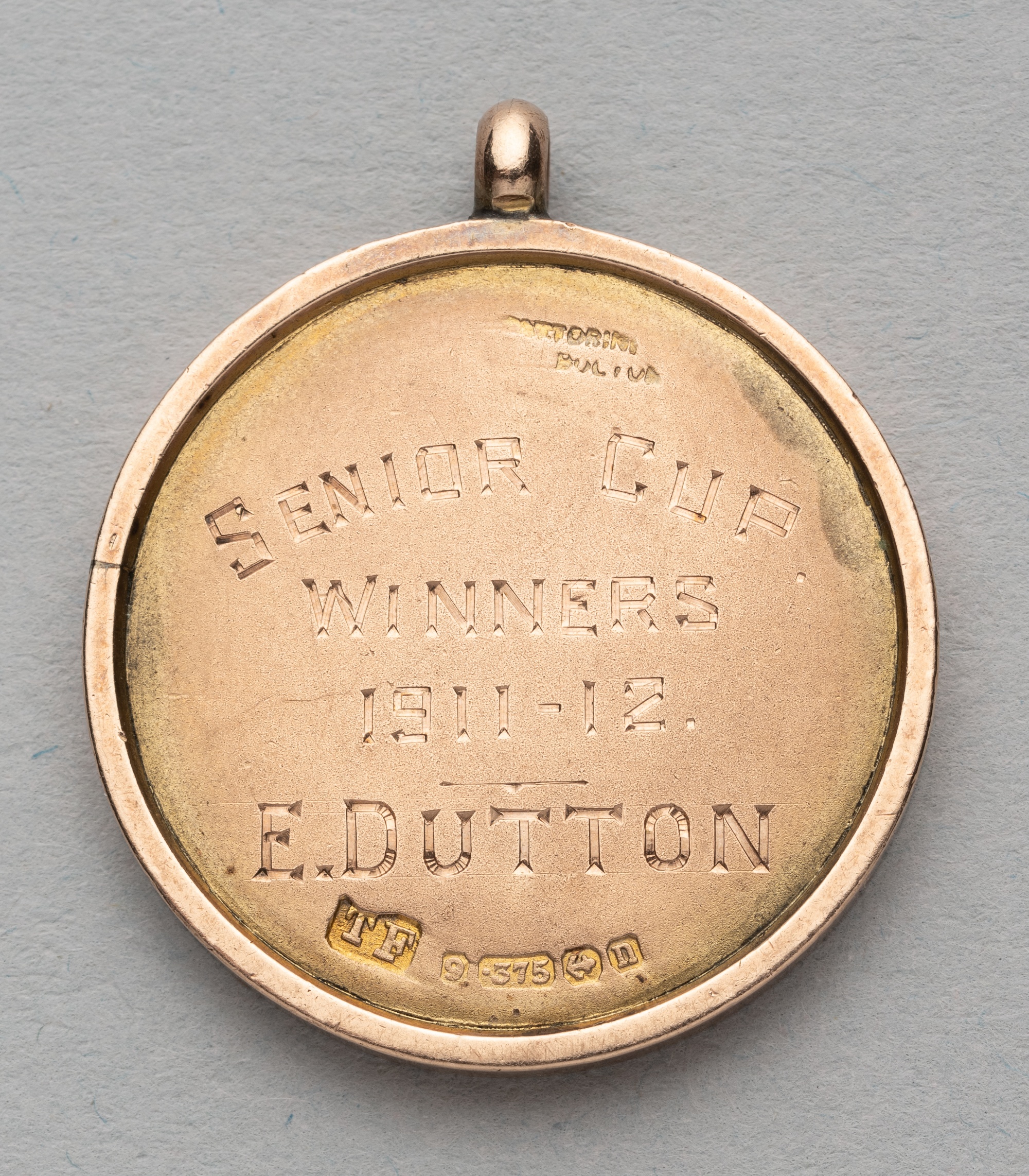 Northumberland Football Association Senior Cup winner's medal awarded to Newcastle United's Edwin Dutton 1911-12, obverse with red enamelled shield and lettering, reverse engraved SENIOR CUP WINNERS 1911-12 E. DUTTON, circular, 9ct gold Birmingham 1912 by Thomas Fattorini, weight 14gms., diameter 31mm. See next lot for a further medal won by E Dutton as a coach for Ipswich Town.
