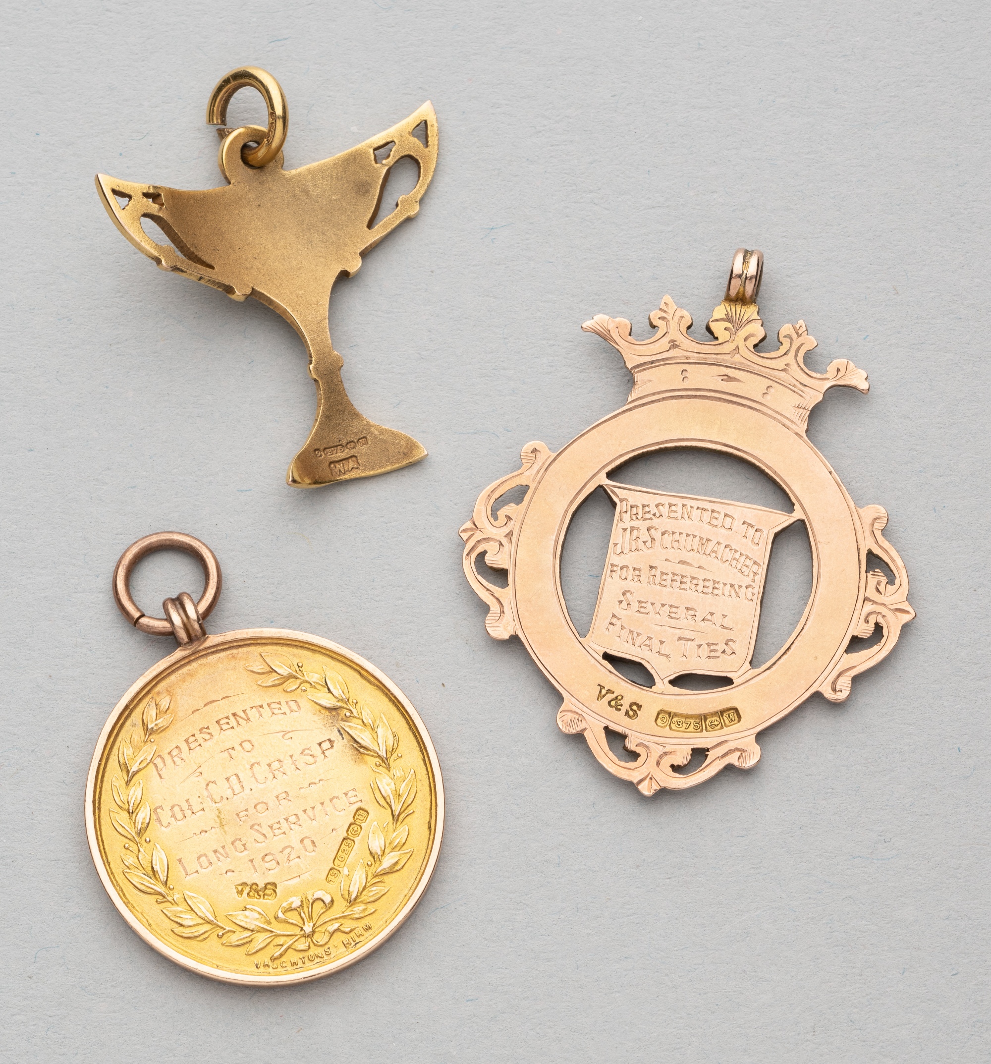 Three football medals relating to Essex football, comprising Essex County Senior Challenge Cup medal awarded to referee J.R. Schumacher for several ties, obverse enamelled with crest and lettering, revere engraved PRESENTED TO J.R SCHUMACHER FOR REFEREEING SEVERAL TIES, 9ct gold Birmingham 1921 by Vaughton & Sons, 40 by 32mm.; M.C.F.A. Long Service medal awarded to Col. C.D. Crisp, 1920, obverse the shied crest and M.C.F.A., reverse engraved PRESENTED TO COL. C.D. CRISP FOR LONG SERVICE 1920, 15ct gold Birmingham 1919 by Vaughton & Sons, circular with suspension ring, diameter 25mm.: The Clacton & District Charity Cup 1937-38 trophy pendant, in the form of the twin-handled trophy cup engraved THE CLACTON & DISTRICT CHRITY CUP 1937-38, 9ct gold Birmingham 1937 by William Adams Ltd, with suspension ring, 27 by 27mm., total weight 9ct: 12gms., 15ct: 10gms., (3)