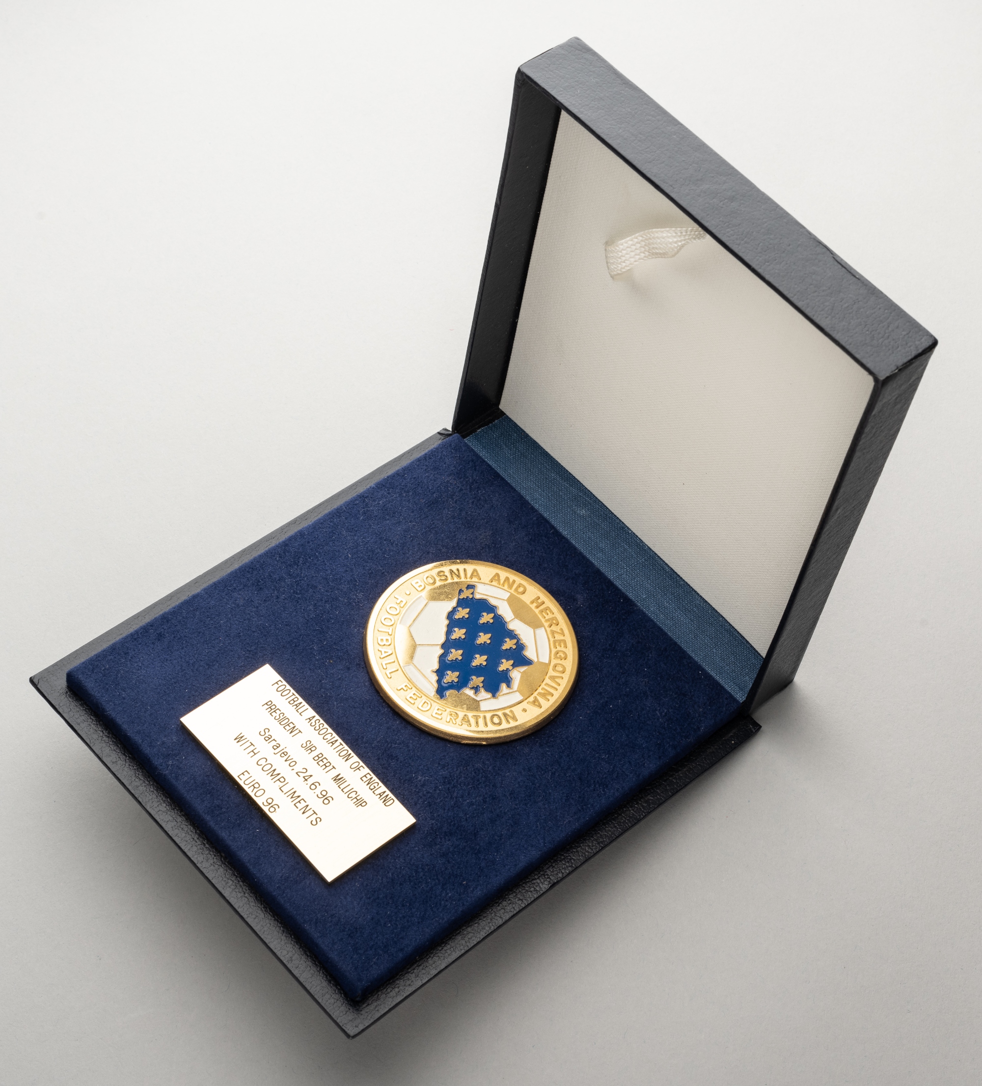 A Bozina and Herzegovina Football Federation medal, issued at Euro '96, in presentation case set with a plaque inscribed FOOTBALL ASSOCAITON OF ENGLAND PRESIDENT SIR BERT MILLICHIP SAVAJEVO, 24.6.96 WITH COMPLIMENTS EURO 96, in hinged case