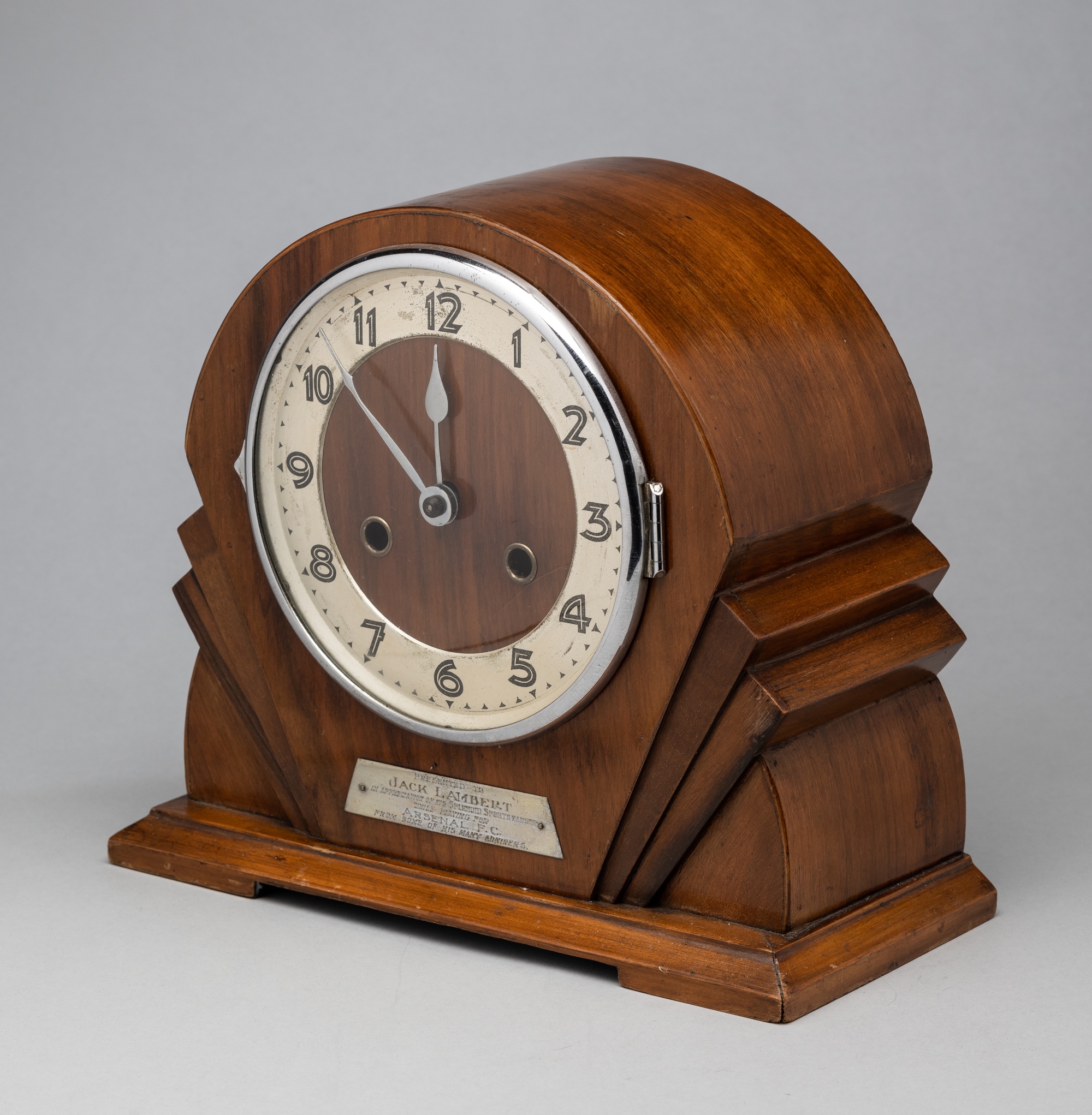 An Art Deco wooden cased mantel clock presented to the Arsenal footballer Jack Lambert, set with a plaque reading PRESENTED TO JACK LAMBERT IN APPRE
