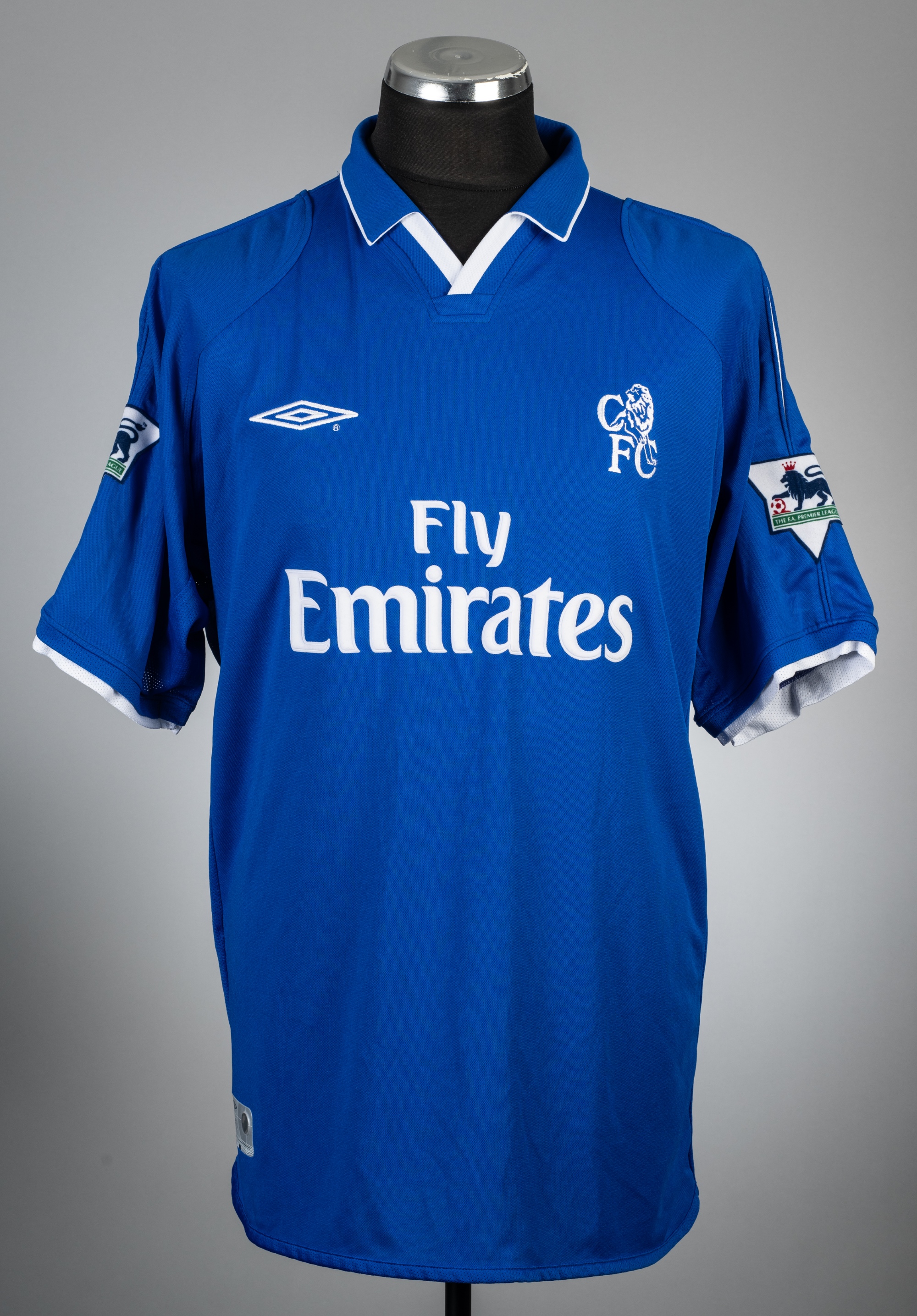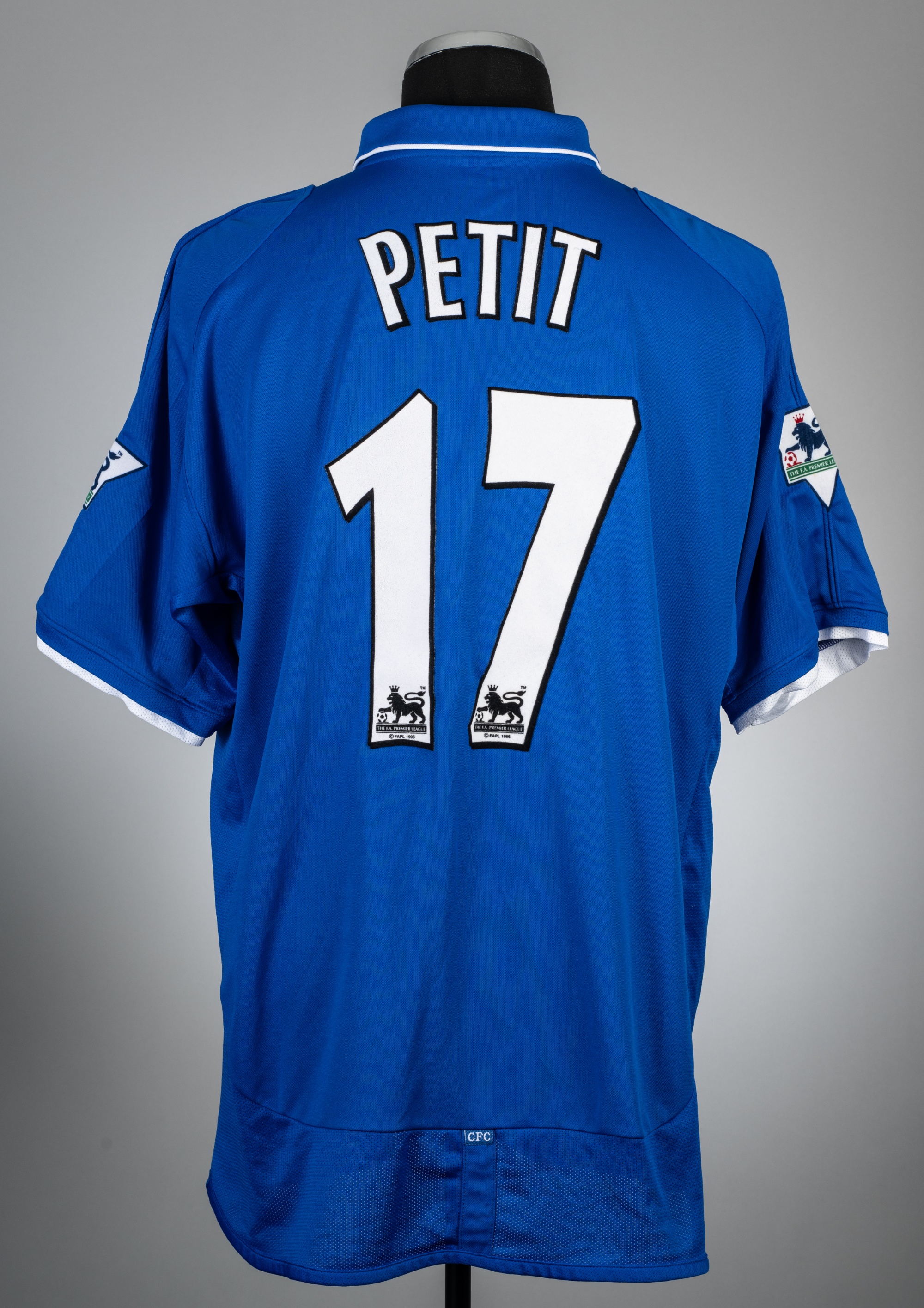 Emmanuel Petit blue Chelsea no.17 home jersey, season 2001-02, Umbro, player issued short-sleeved with THE FA PREMIER LEAGUE sleeve badges, club crest and sponsor logo, reverse lettered PETIT, size XL