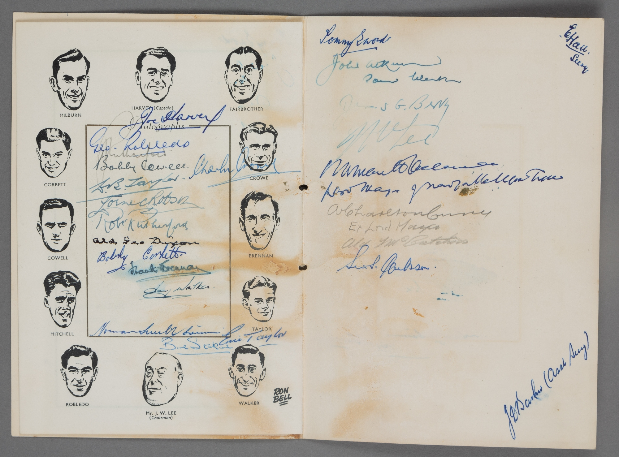 George Robledo's Newcastle United signed F.A. Cup final dinner menu, held at Mansion House, 8th May 1951, 8-page menu with card cover, signed on inside back cover by members of the Newcastle United's winning team in pen and pencil, including Harvey, Robledo, Cowell, Taylor, Corbett, Walker, Brennan, Bob Stokoe, J.W Lee (chairman), and others, slightly water damaged with staining The George Robledo Collection (Lots 1133 to 1143) Provenance: By family descent. The Property of George’s daughter Elizabeth Robledo.