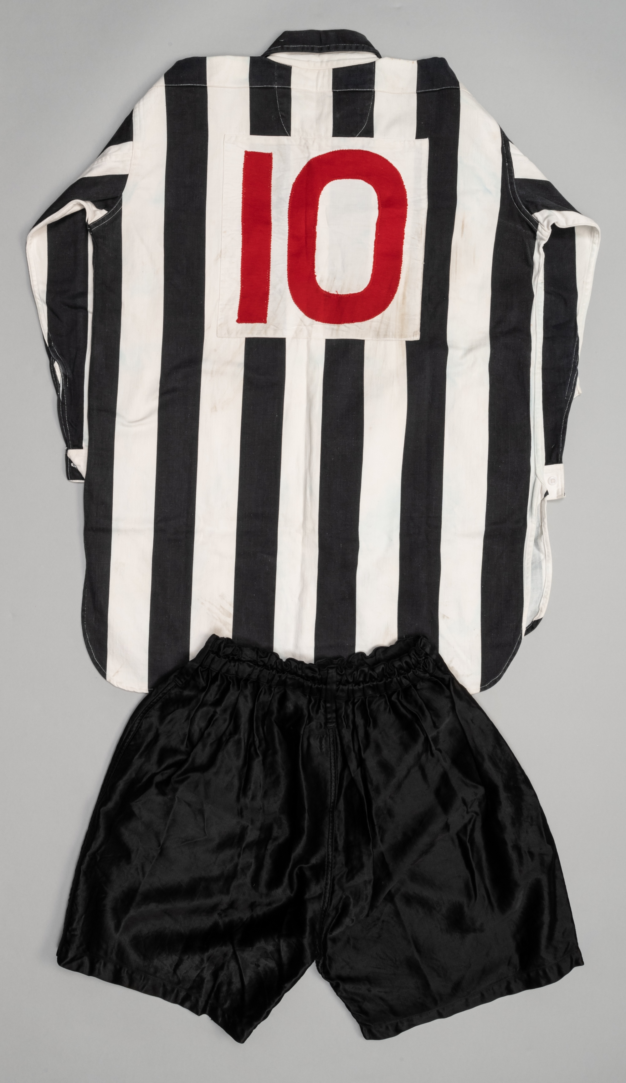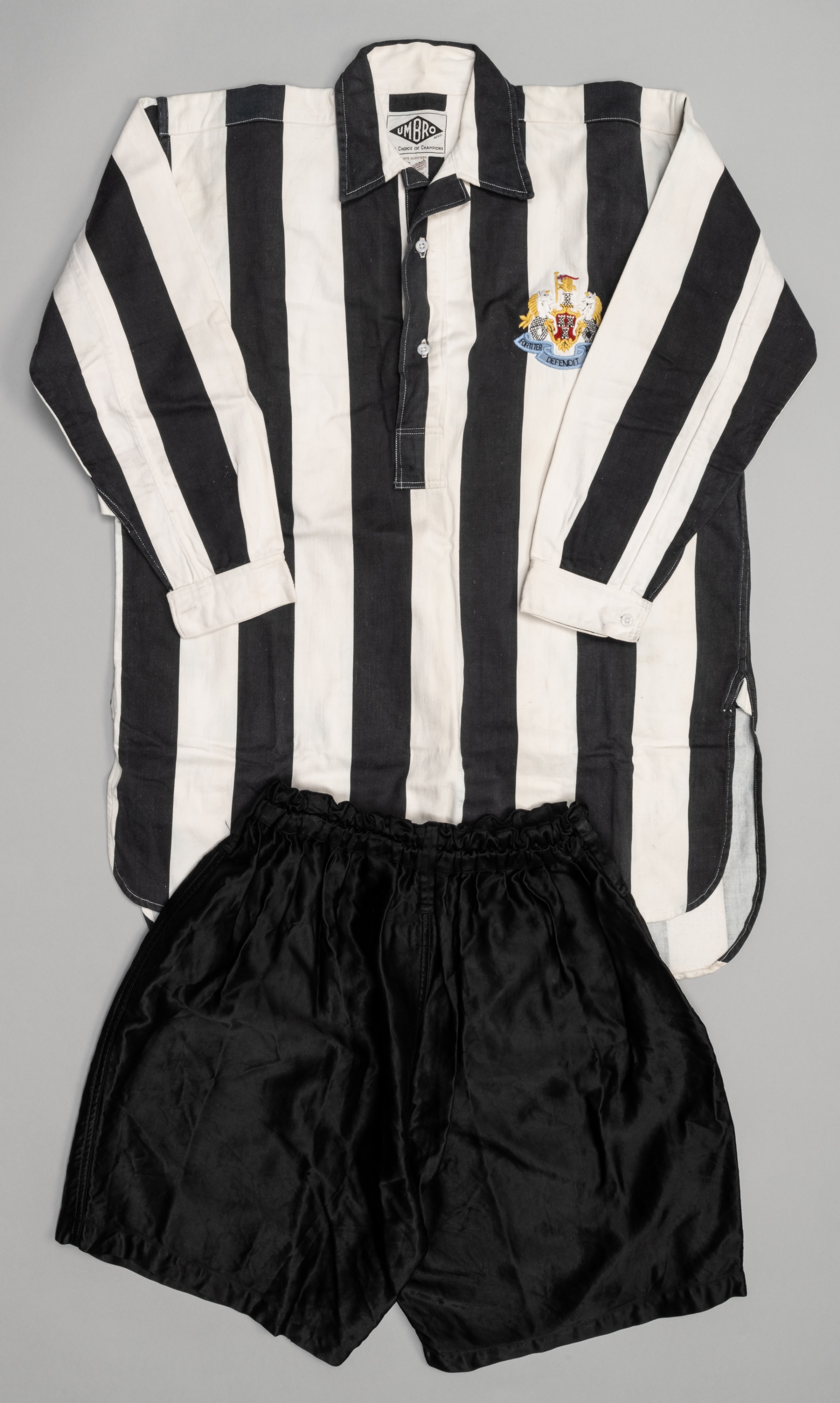 Black & white striped Newcastle United F.A. Cup final no.10 jersey v Arsenal, played at Wembley, 3rd May 1952, Umbro, long-sleeved with embroidered club crest, two button closing, buttoned cuffs, reverse numbered 10 in red on white square, bears Umbro and Stan Seymour neck labels, remnants of size label M; sold with black Umbro shorts, bearing internal Umbro label, size 38, both in good condition relative to age, (2) Newcastle United defeated Arsenal 1-0, with the goals by Chile's George Robledo. The George Robledo Collection (Lots 1133 to 1143) Provenance: By family descent. The Property of George’s daughter Elizabeth Robledo.