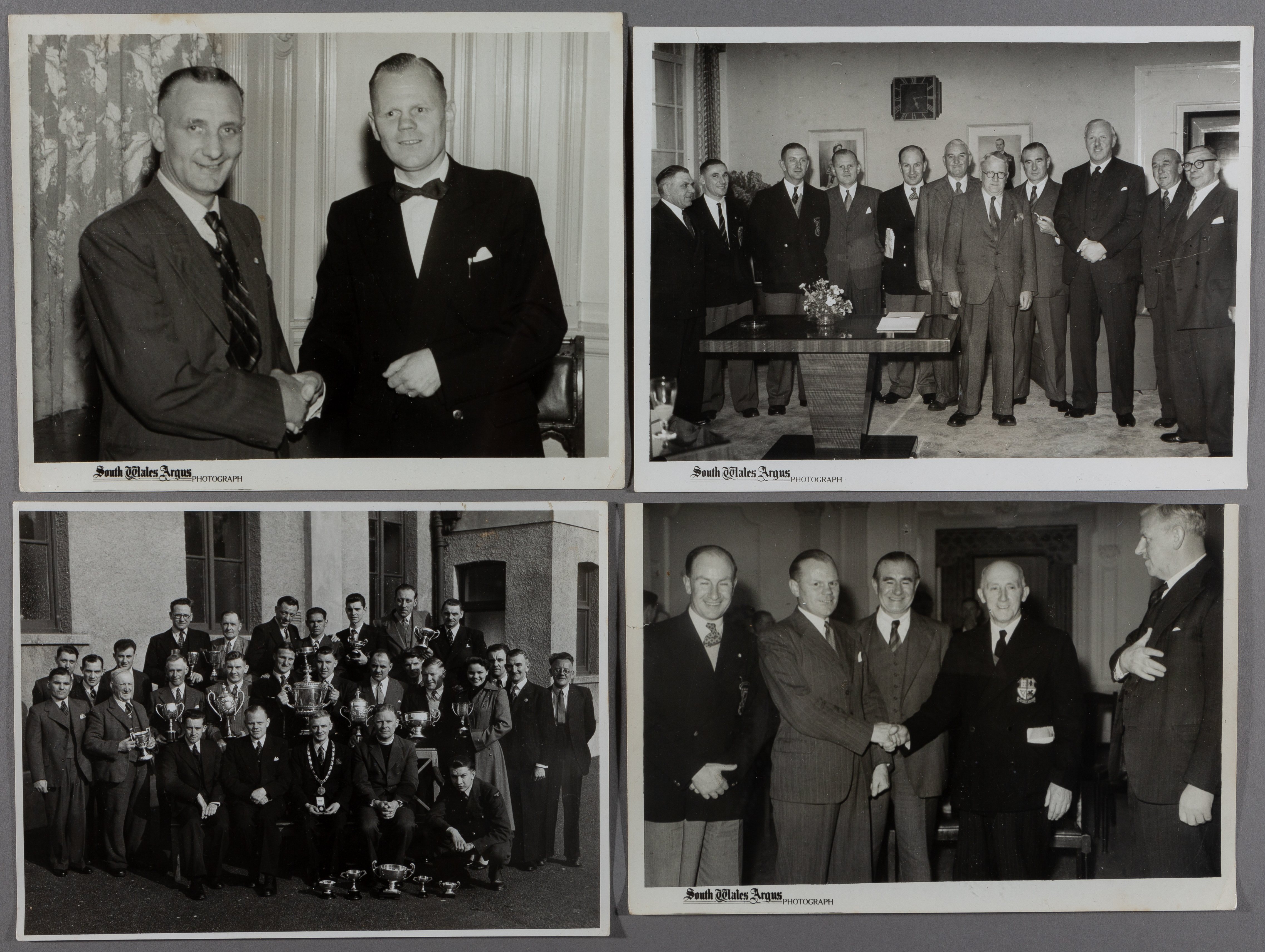 Mervyn "Sandy" Griffiths collection relating to being referee of 1953 Cup final between Blackpool v Bolton, otherwise known as "Matthews Final", his own personal file of newspaper cuttings, cartoon, illustrations re: his involvement plus four b & w photographs covering his appointment with Sir Stanley Rous receiving his referee association appointment medal at dinner/public event celebrating occasion, Griffiths awarded the free kick from around the edge of the penalty box with two minutes to go from which Stan Mortensen equalised, the rest is history. Interesting insight before match, he purchased 50 programmes to give to his class in Newport, Wales and held up the kick off to allow Ernie Taylor to tie his laces, (qty) Mervyn "Sandy" Griffiths international referee started his career as a linesman in 1939. And was a Football League referee from 1945-59 and FIFA listed 1949-58. He refereed international matches all over the world, together with the famous 1953 Cup final Bolton v Blackpool, his decision with two minutes to go enabled Stan Mortensen to equalise with a free kick, the rest is history. He went into the crowd before the match and bought 50 programmes to give to his pupils back in Newport, Wales, where he was a teacher. Griffiths represented Wales in three World Cups 1950, 1954 and 1958. In 1950 he appeared in the opening match as linesman and refereed Brazil v Uruguay and Uruguay v Spain. In 1954 he refereed the opening game Yugoslavia v France and semi-final Hungary v Uruguay and assisted William Ling as lineman in the final Hungary v West Germany with the score at 3-2 Griffiths flagged for offside, Ferenc Puskas shot which beat West Germany goalkeeper Toni Turek. In 1958 he refereed Yugoslavia v France and Brazil v France in semi-final. He set a unique hat tick, first Welshman to referee an international at Wembley, to referee a Cup final and the only Welshman to appear in a World Cup Final. Next two lots also relate to Mervyn "Sandy" Griffiths and a further advert will be included in the Graham Budd World Cup Auction in November 2022.