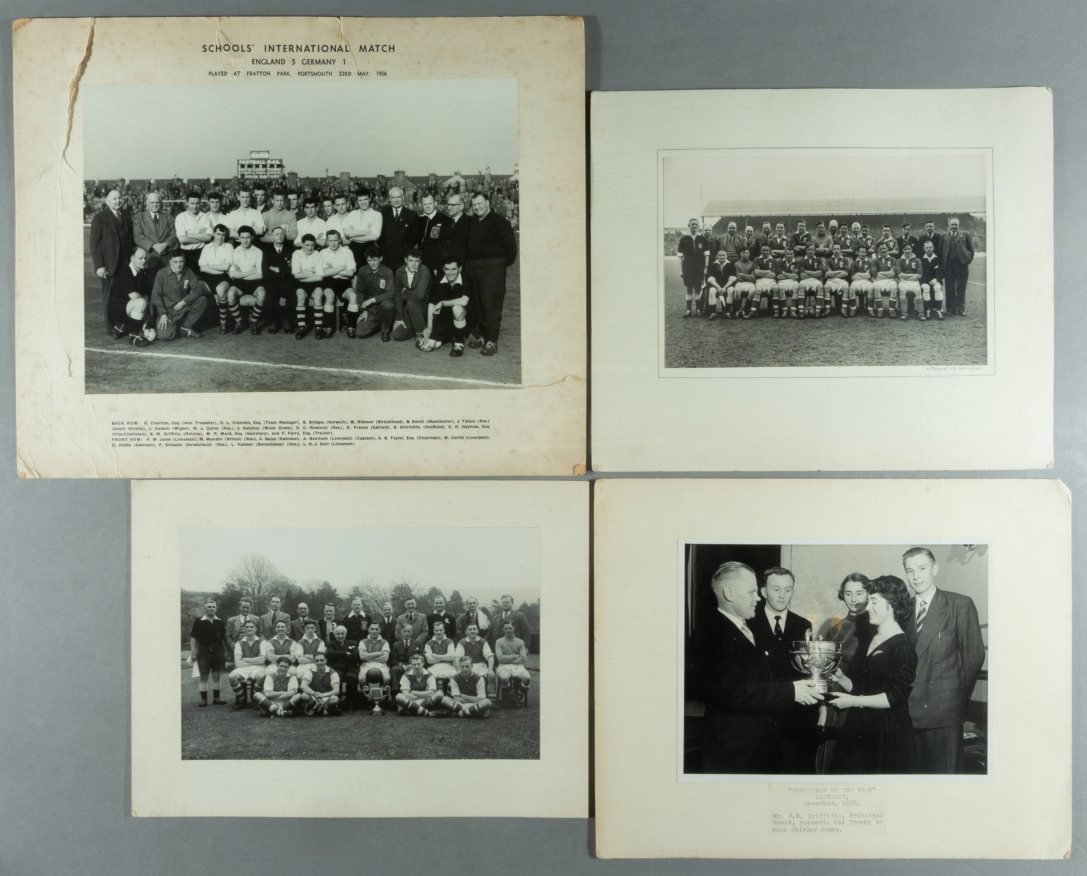 Mervyn "Sandy" Griffiths collection of b & w photographs, all original and annotated in Griffith's hand, approx. 12 by 9in., some matted, include match action, Festival of Britain v Argentina 1951. Meeting the late Prince Phillip kick of England v Scotland 1949 with Billy Wright after Wolves v Spartak 1954. at Charlton signing autographs and in Charlton dressing room before match March 1953 (3). On tour with Charlton in Germany plus various matted photographs including with captains before kick off Swansea v Cardiff, large 15 by 12in. matted photograph schools international v Germany at Portsmouth 23/5/1956 and includes telegram from Bulgarian FA requesting him to supply details for visa to referee Oudarnik Sofia v Djurgarden 21/11/1954 and others, (21) Mervyn "Sandy" Griffiths international referee started his career as a linesman in 1939. And was a Football League referee from 1945-59 and FIFA listed 1949-58. He refereed international matches all over the world, together with the famous 1953 Cup final Bolton v Blackpool, his decision with two minutes to go enabled Stan Mortensen to equalise with a free kick, the rest is history. He went into the crowd before the match and bought 50 programmes to give to his pupils back in Newport, Wales, where he was a teacher. Griffiths represented Wales in three World Cups 1950, 1954 and 1958. In 1950 he appeared in the opening match as linesman and refereed Brazil v Uruguay and Uruguay v Spain. In 1954 he refereed the opening game Yugoslavia v France and semi-final Hungary v Uruguay and assisted William Ling as lineman in the final Hungary v West Germany with the score at 3-2 Griffiths flagged for offside, Ferenc Puskas shot which beat West Germany goalkeeper Toni Turek. In 1958 he refereed Yugoslavia v France and Brazil v France in semi-final. He set a unique hat tick, first Welshman to referee an international at Wembley, to referee a Cup final and the only Welshman to appear in a World Cup Final. The previous two lots also relate to Mervyn "Sandy" Griffiths and a further advert will be included in the Graham Budd World Cup Auction in November 2022.