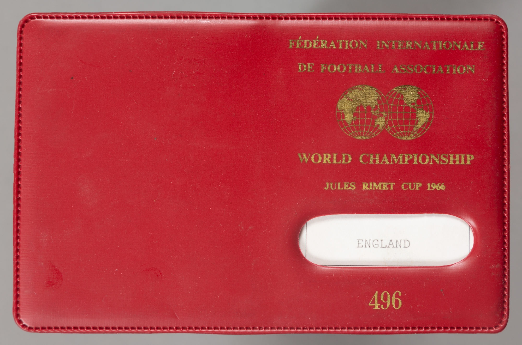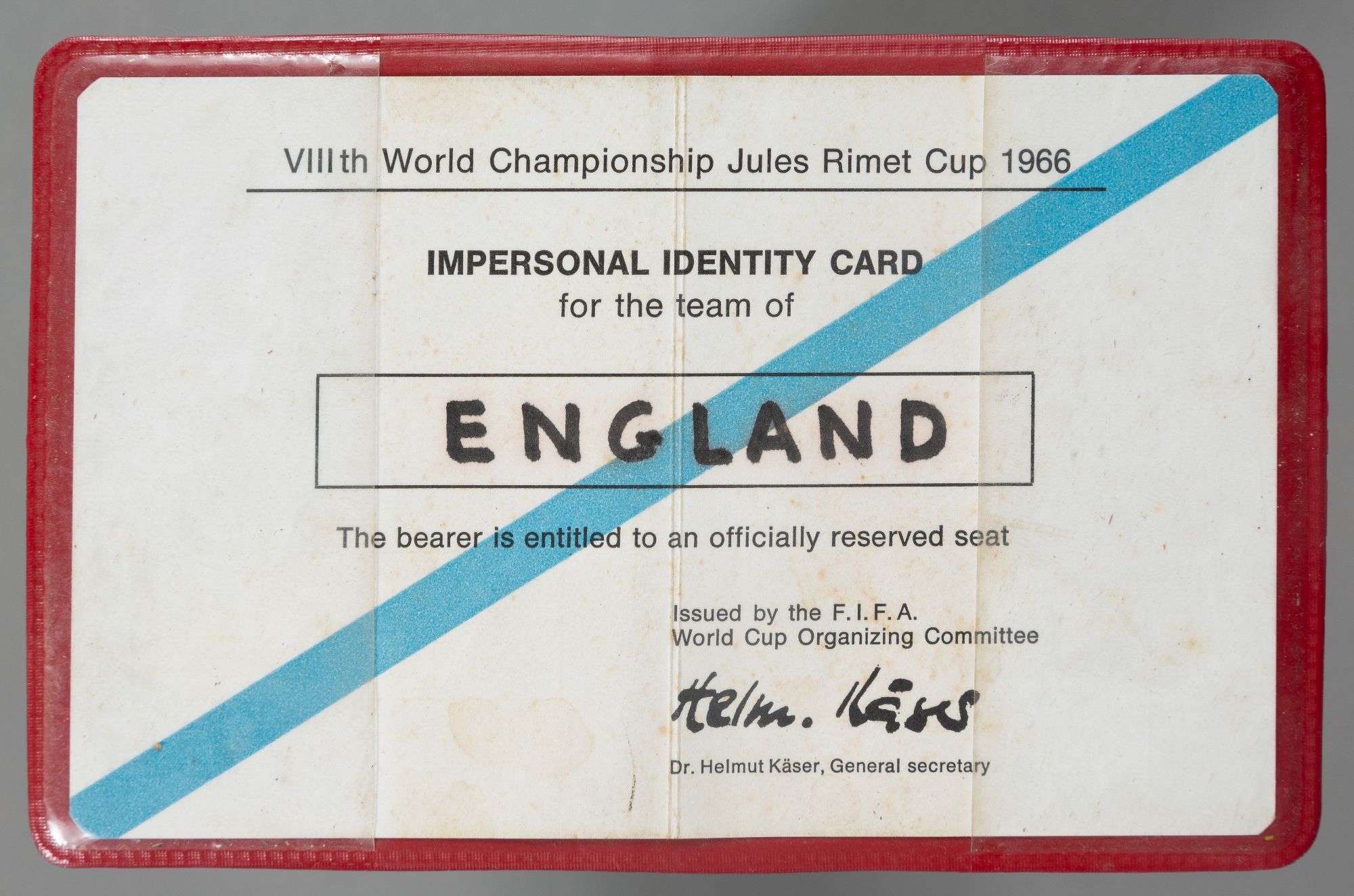 The FIFA issued impersonal identity card for the team of England at the 1966 World Cup, in red FIFA wallet, issued by Dr Helmut Kaser, FIFA Organisin