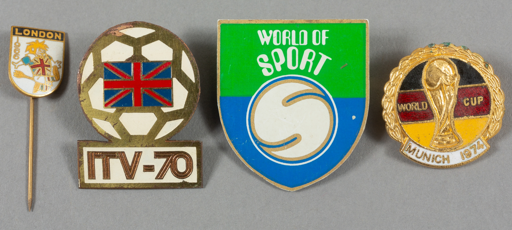 Two ITV badges issued to the England football manager Sir Alf Ramsey, one for the 1970 World Cup, the other for World of Sport; sold together with a 1966 and a 1974 World Cup badge (4) Provenance: Acquired by Coffer Sports from Sir Alf Ramsey.