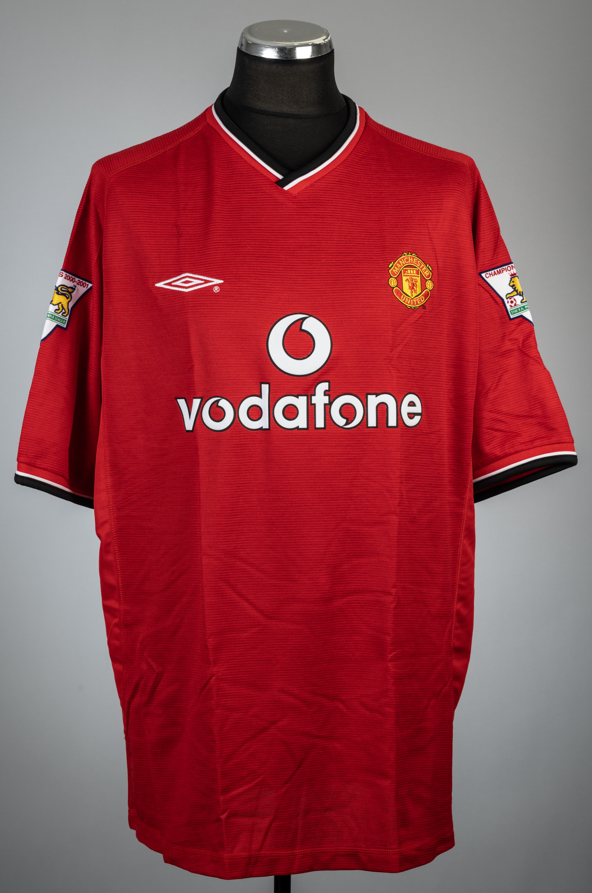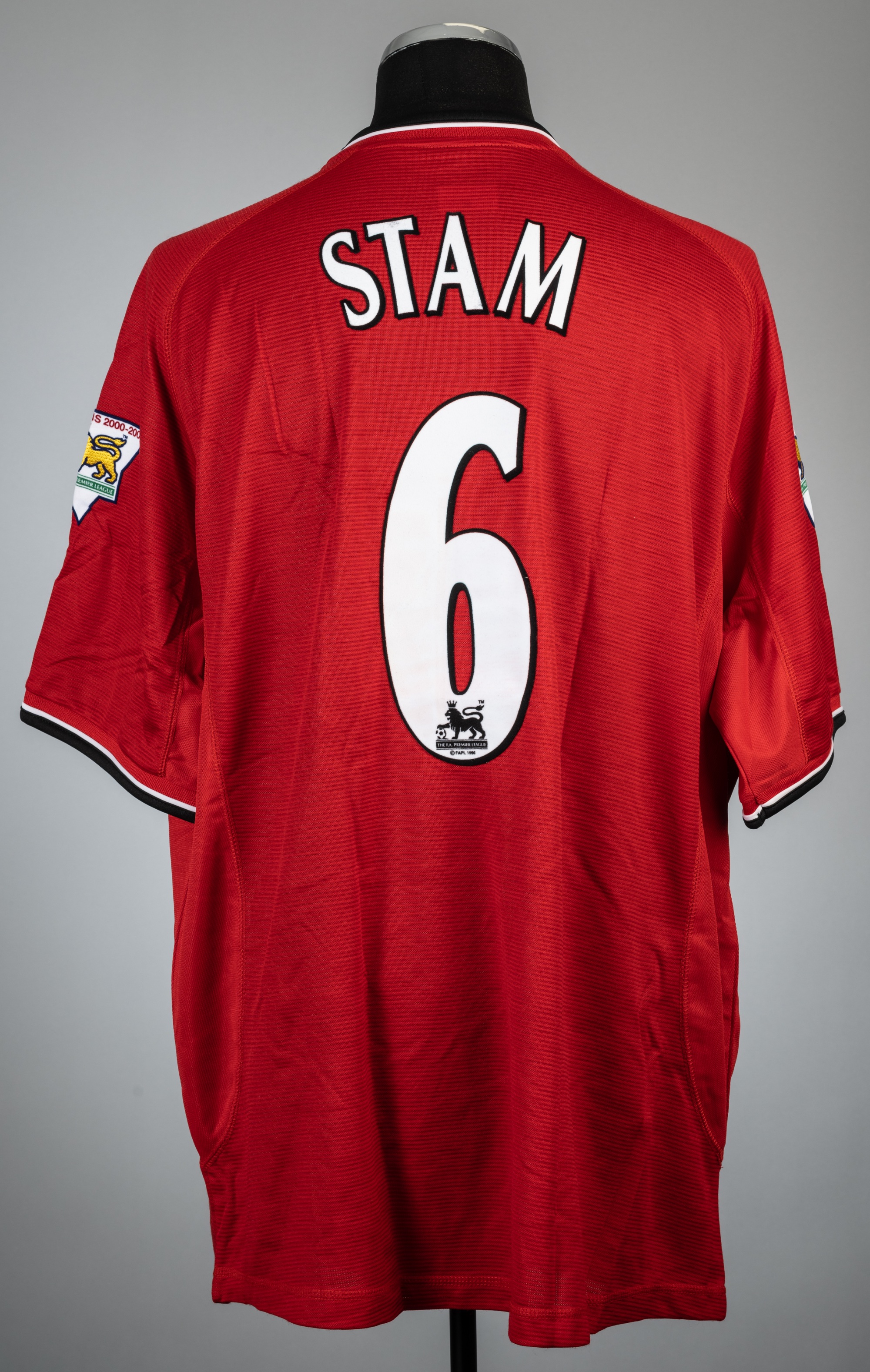 Jaap Stam red Manchester United no.6 home jersey, season 2001-02, Umbro, short-sleeved with THE FA PREMIER LEAGUE CHAMPIONS 2000-01 sleeve badges, club crest and sponsor logo, reverse lettered STAM, size XXL, neck label bearing K in black marker pen
