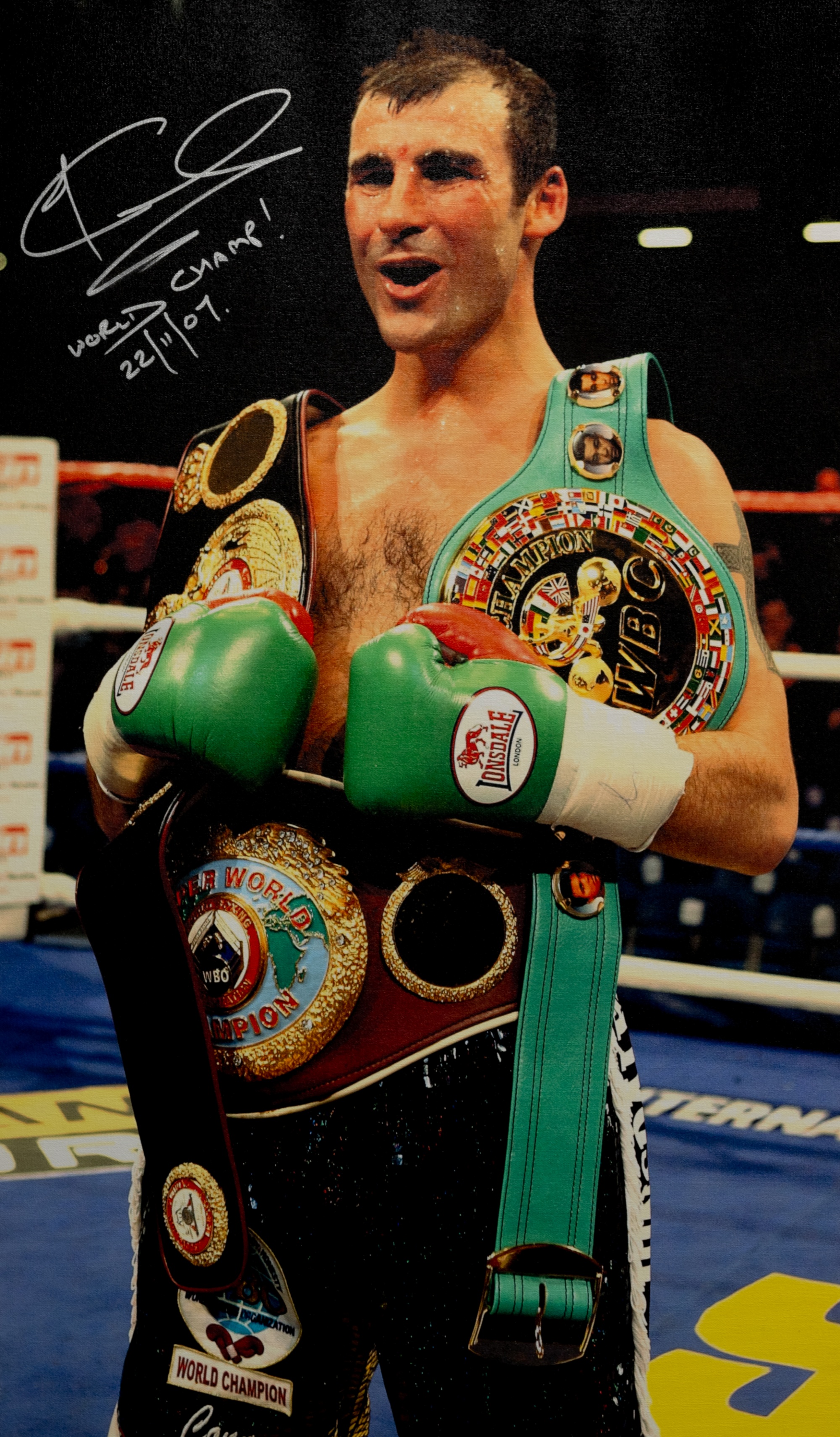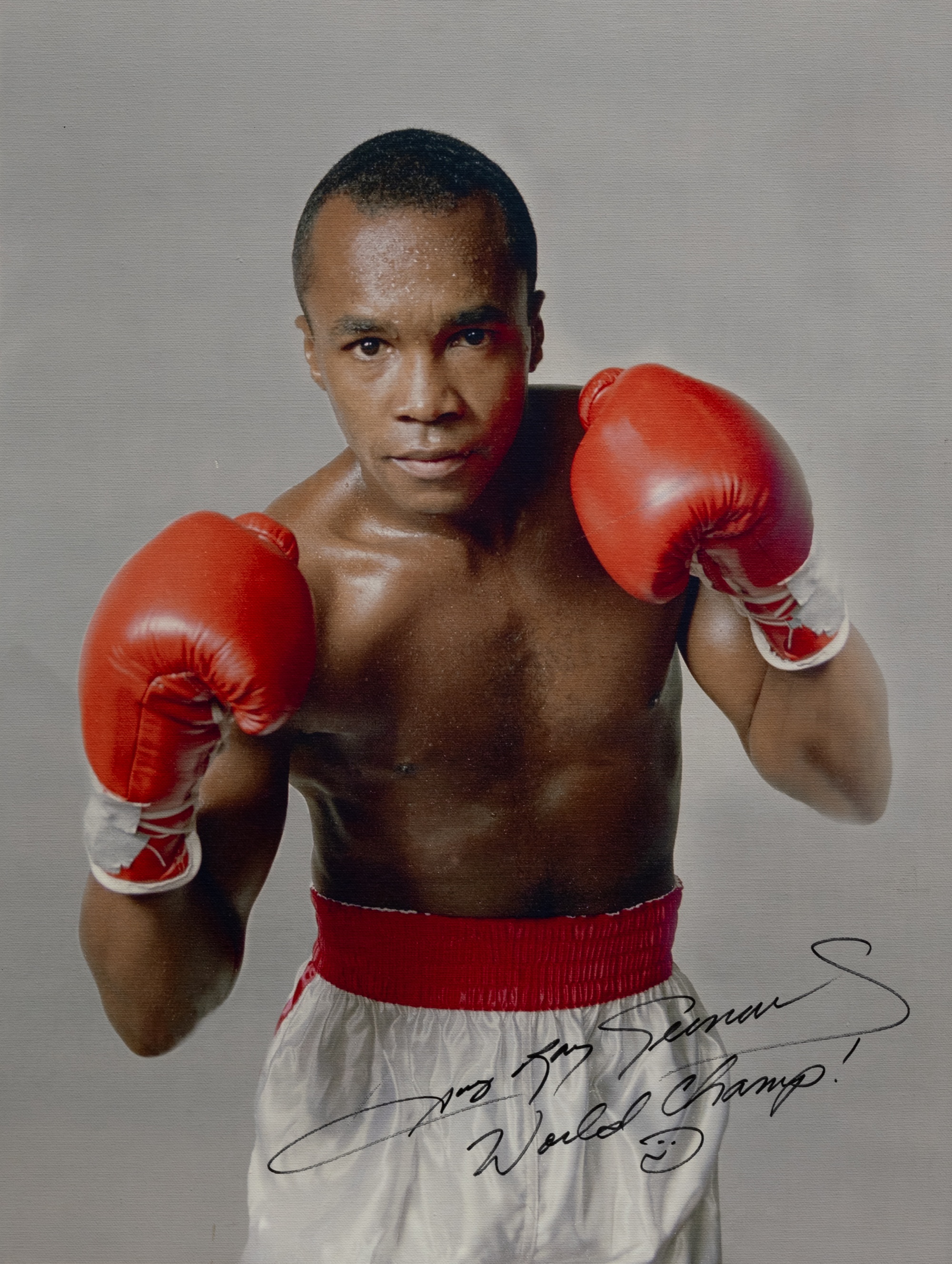 Three signed boxing print canvases, comprising Leon Spinks signed image of the bout v Muhammad Ali, New Orleans, 15th September 1978, the b & w print on canvas depicting Leon Spinks hitting Muhammad Ali with his right, signed in silver marker pen, 51 by 60cm; Sugar Ray Leonard signed boxing portrait image, signed in black marker pen, 60 by 45cm.; Joe Calzaghe signed image of him after defeating Mikkel Kesslar in the bout for the WBO, WBC and WBA World Super Middleweight titles at Millennium Stadium, 3rd November 2007, signed in silver marker pen, 80 by 47cm.; the lot also including a yellow Lonsdale boxing glove signed by Frank Bruno (4) Muhammad Ali defeated Leon Spinks in the 15th round unanimous decision.