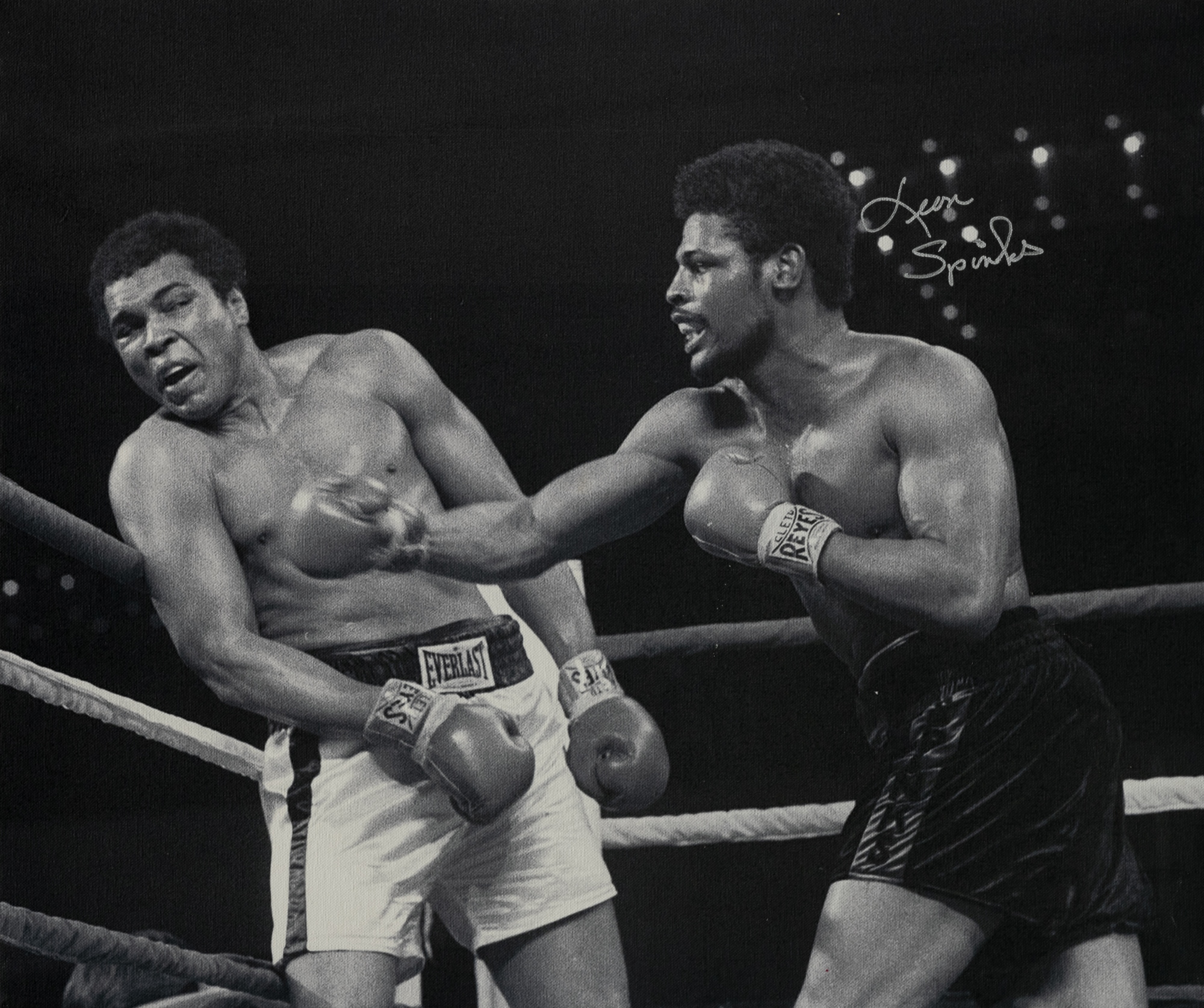 Three signed boxing print canvases, comprising Leon Spinks signed image of the bout v Muhammad Ali, New Orleans, 15th September 1978, the b & w print