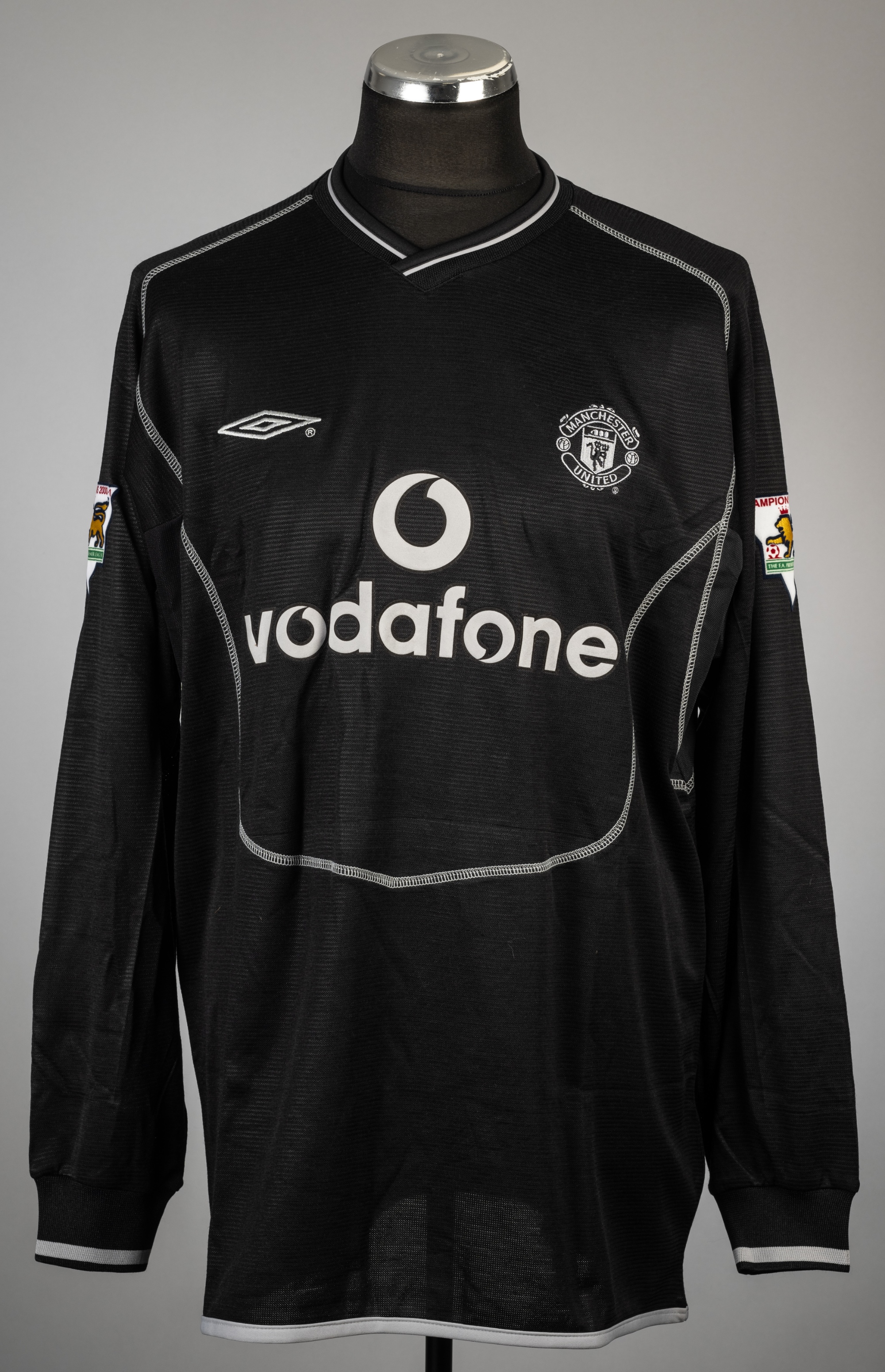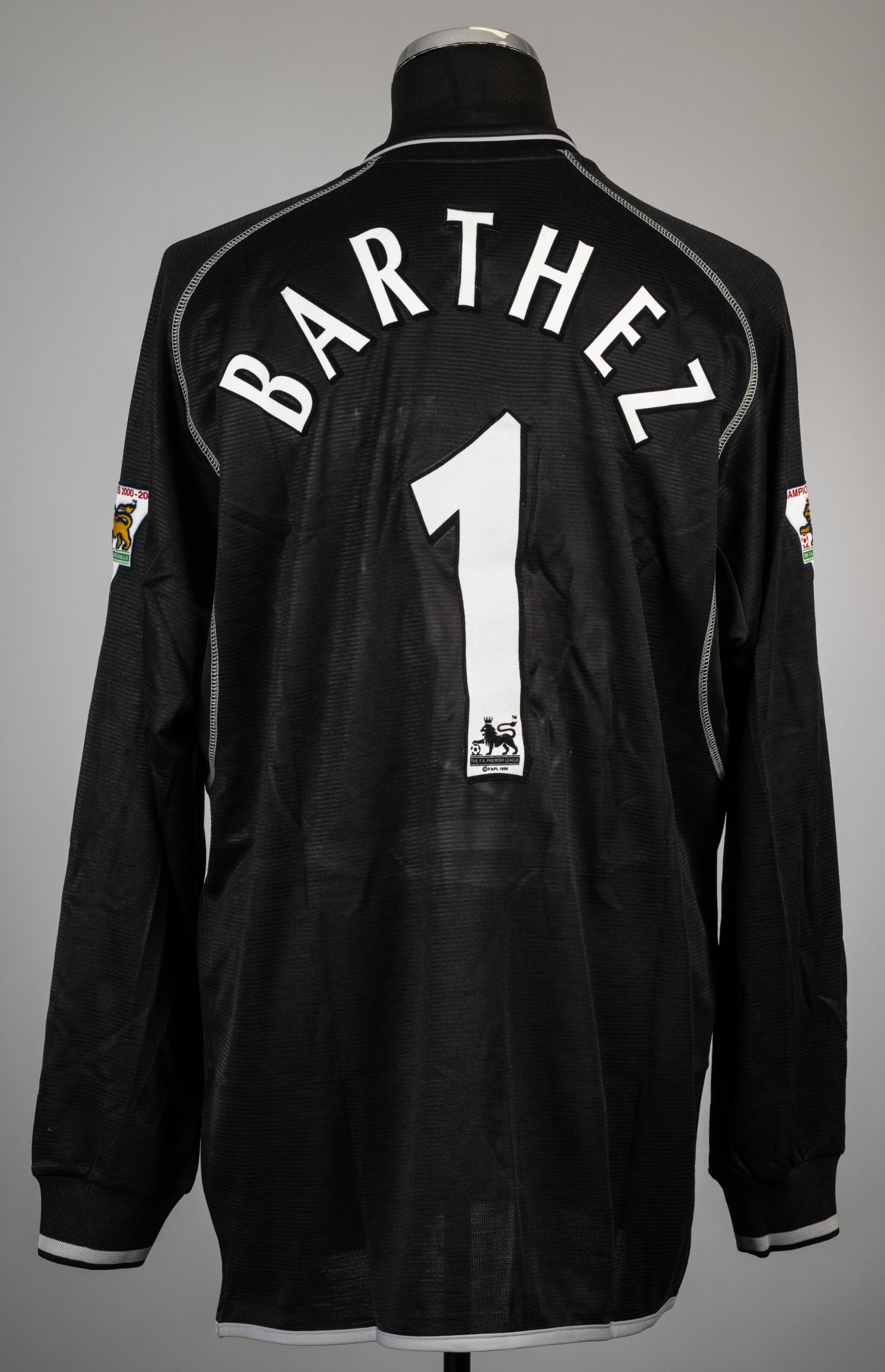 Fabian Barthez black Manchester United no.1 goalkeeper's home jersey, season 2001-02, Umbro, long-sleeved with THE FA PREMIER LEAGUE CHAMPIONS 2000-2
