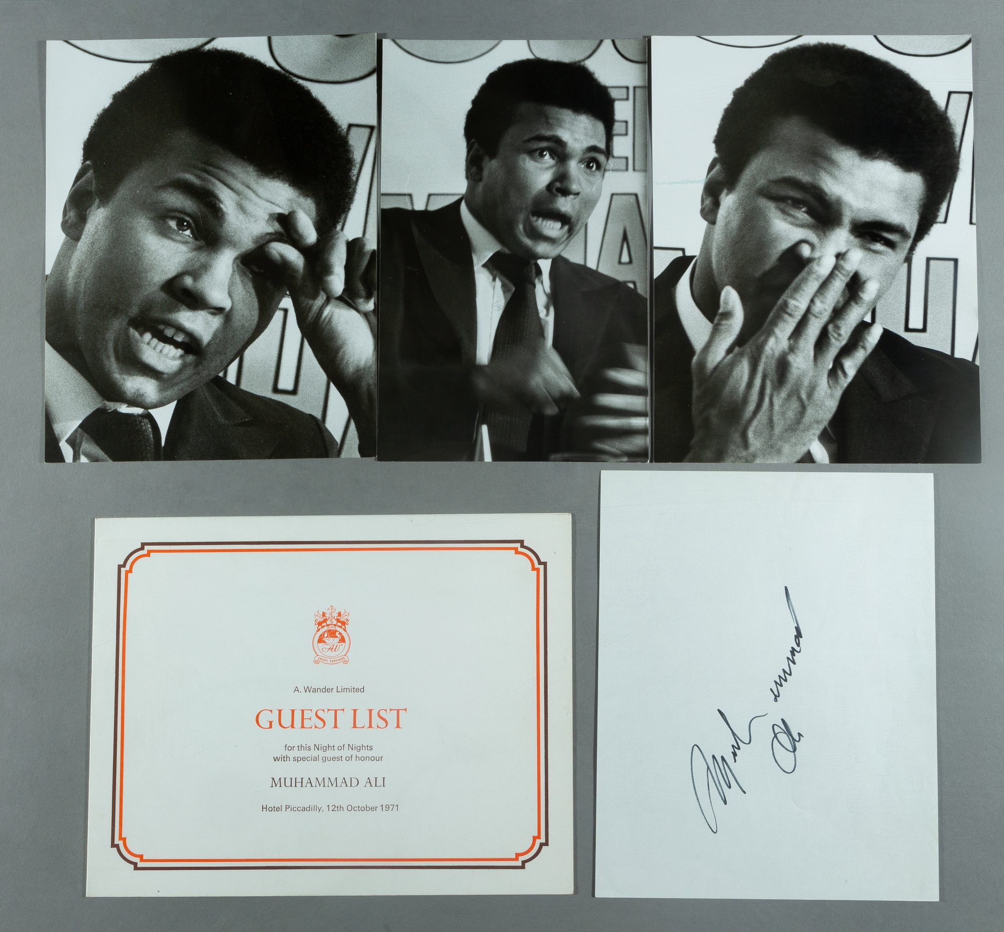 MUHAMMAD ALI WORLD HEAVYWEIGHT BOXING CHAMPION 1964-78 ORIGINAL VINTAGE 1971 INK AUTOGRAPH PLUS GUEST LIST AND THREE ORIGINAL PHOTOGRAPHS Muhammad Ali. born Cassius Marcellus Clay Jr. 17th January 1942 – 3rd June 2016) was an American professional boxer and activist. He is widely regarded as one of the most significant and celebrated sports figures of the 20th century. Cassius Clay was born and raised in Louisville, Kentucky, and began training as an amateur boxer when he was 12 years old. At age 18, he won a gold medal in the light-heavyweight division at the 1960 Summer Olympics in Rome and turned professional later that year. At age 22 in 1964, he won the WBA, WBC, and lineal heavyweight titles from Sonny Liston in a big upset. Clay then converted to Islam and changed his name from Cassius Clay, which he called his "slave name", to Muhammad Ali. Ali is regarded as one of the leading heavyweight boxers of the 20th century. He remains the only three-time lineal heavyweight champion, having won the title in 1964, 1974, and 1978. EXCELLENT LARGE BOLD BLACK INK SIGNATURE OF MUHAMMAD ALI, , . EXCELLENT LARGE EARLY FLOWING 1971 CONTEMPORARY EXAMPLE OF MUHAMMAD ALI’S SIGNATURE (WORLD HEAVYWEIGHT BOXING CHAMPION 1964-1978) CENTRAL TO A WHITE PIECE OF BASILDON BOND WATERMARKED WRITING PAPER SIZE 9” x 7” OBTAINED DURING HIS OVALTINE PROMOTIONAL TOUR TO ENGLAND IN OCTOBER 1971. SOLD ALONG WITH A FOLDOVER GUEST LIST FOR A ‘NIGHT OF NIGHTS’ DINNER HELD AT THE HOTEL PICCADILLY HELD ON THE 12TH OCTOBER 1971 AND THREE BLACK AND WHITE HEAD AND SHOULDERS IMAGES OF ALI. ALL ITEMS IN VERY GOOD CONDITION.
