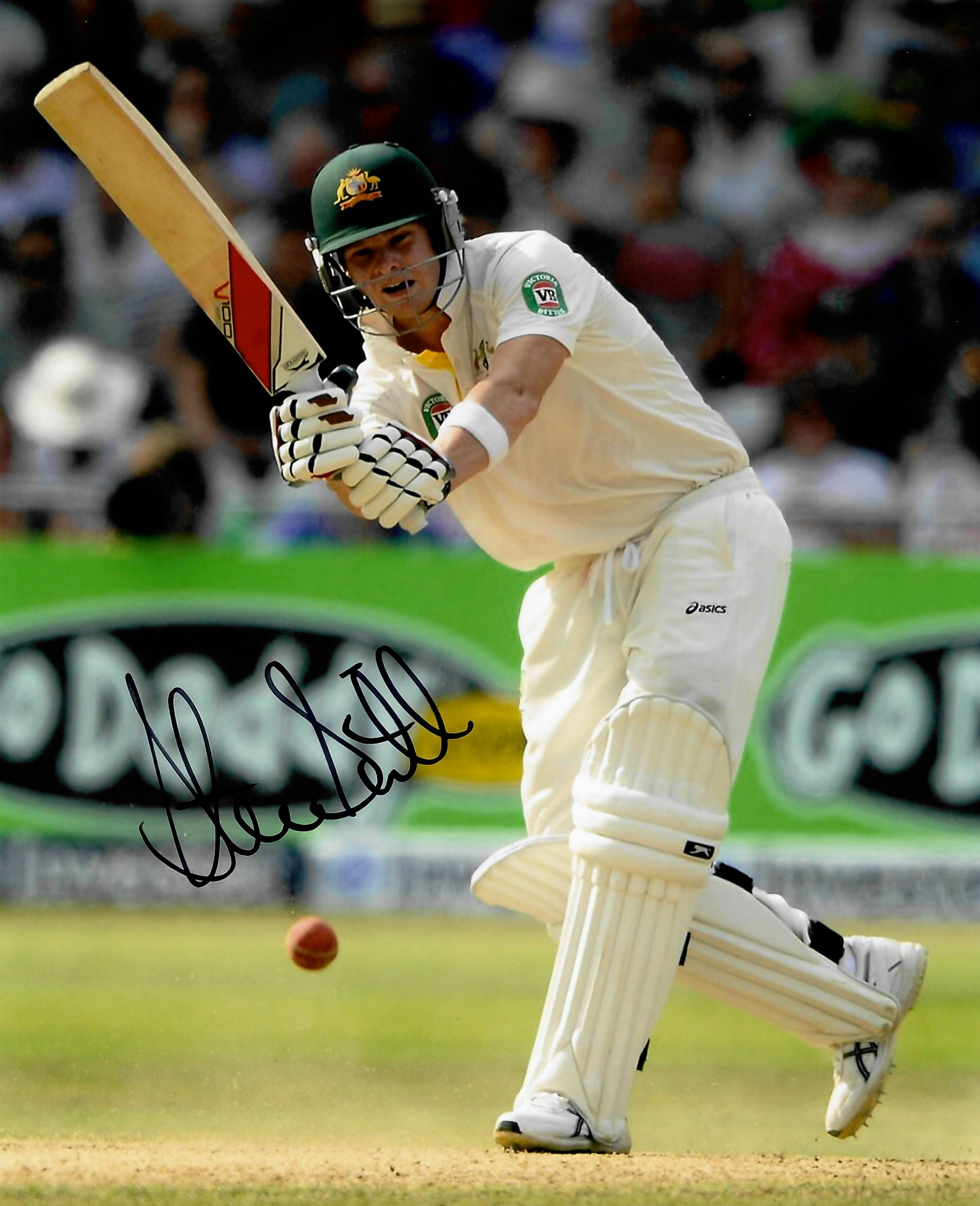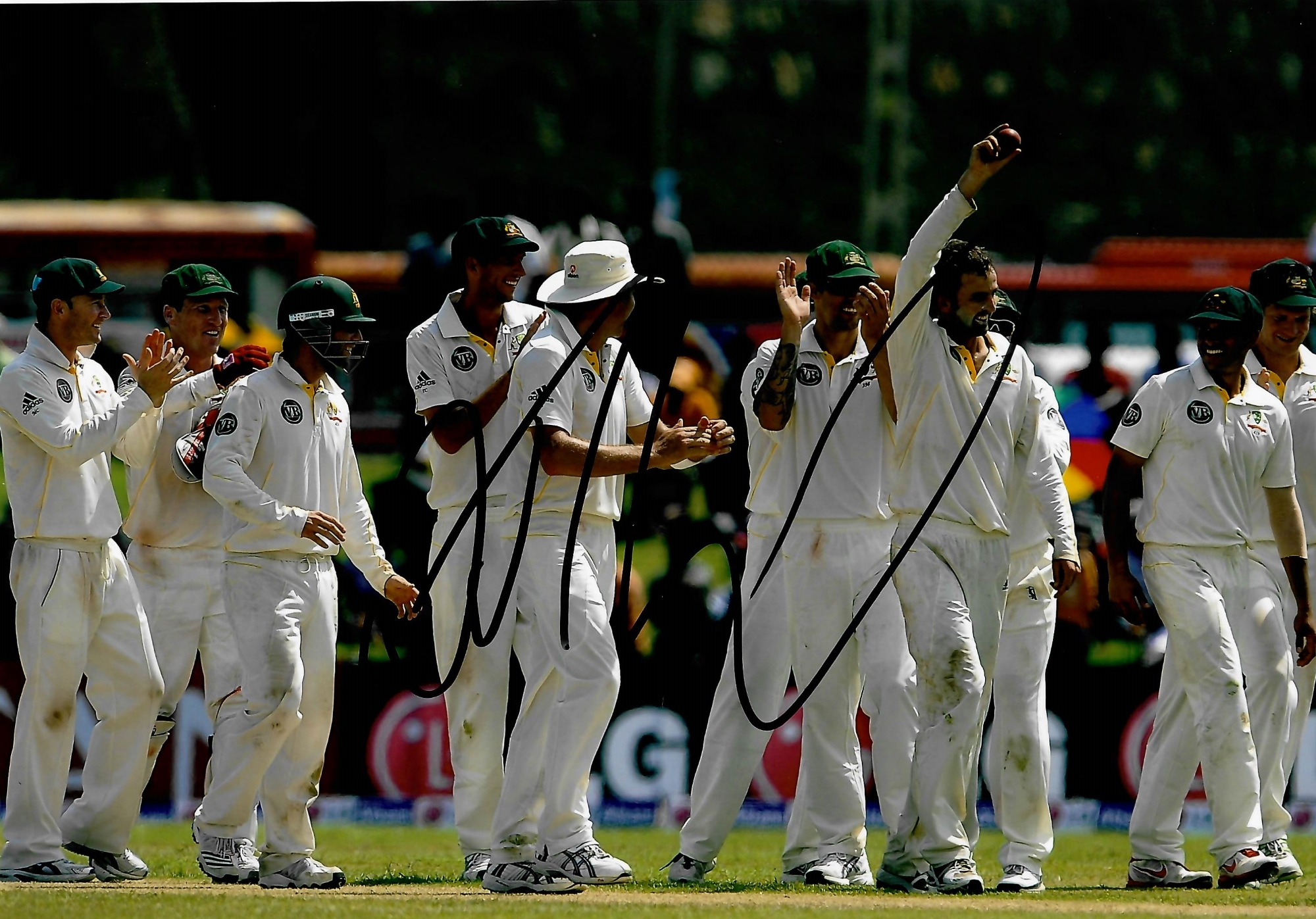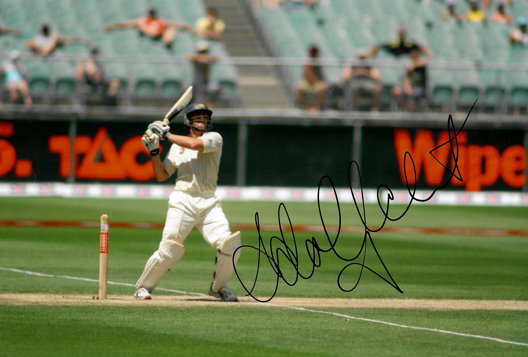 Australian Cricket Collection of signed photographs, including Ricky Ponting, Steve Smith, Mitchell Johnson, Shane Watson, Peter Siddle, Nathan Lyon, all 8 by 10in., Shane Warne, David Warner, Ryan Harris, Matthew Wade, Shaun Marsh, Peter Handscombe, Adam Gilchrist, Mike Hussey , D’Arcy Short, all 8 by 12in., with COA and photo proof of signing, (15)