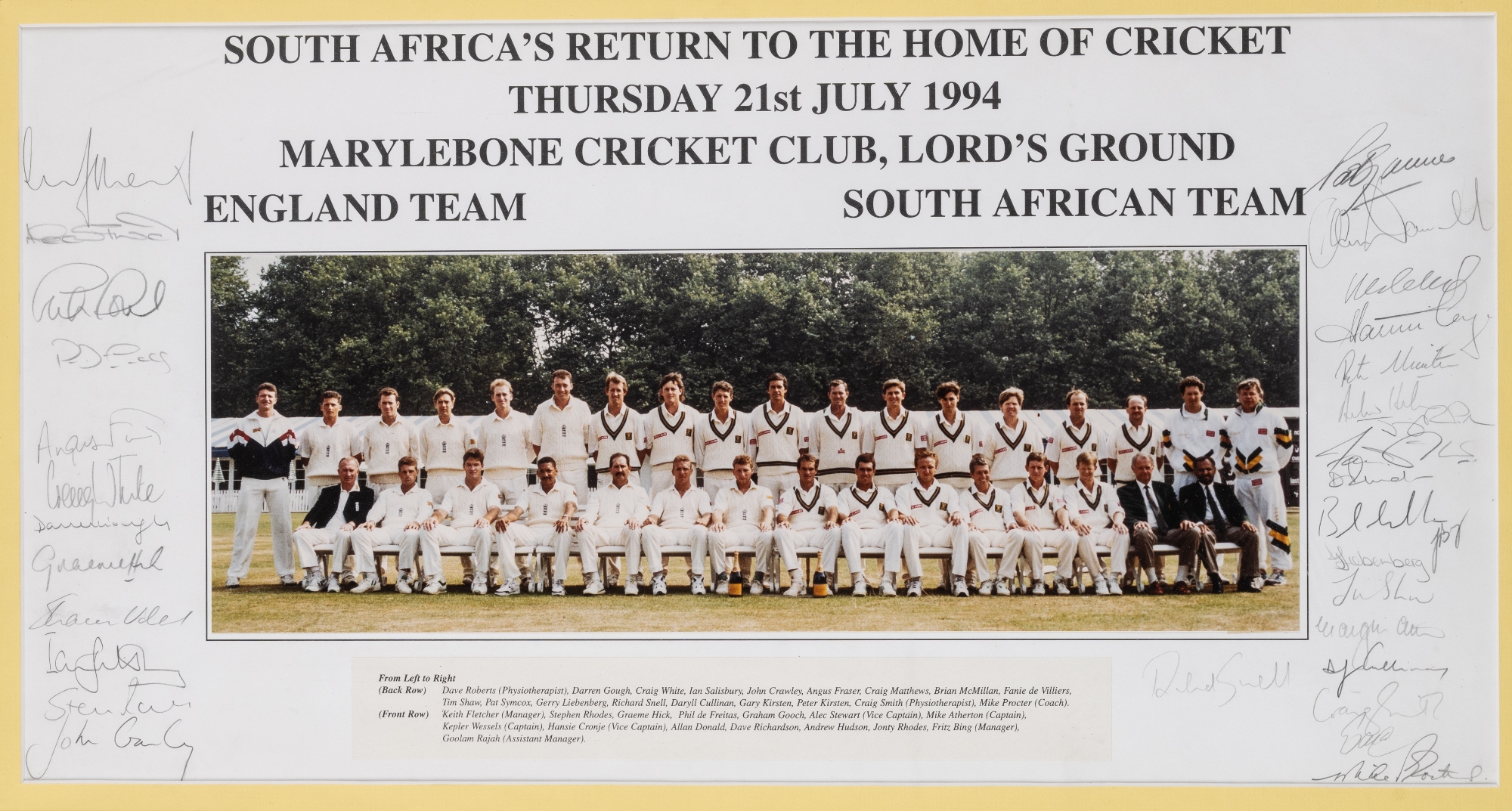 Signed England v South Africa team photograph on their return to the home of cricket Lord's Cricket Ground, 21st July 1994, 14 by 42cm. colour photograph of both teams and management in seated and standing pose at the Nursery End of Lord's cricket ground before the match, applied to a signed mount with signatures by 31 members of both squads in pencil with typed legend above SOUTH AFRICA'S RETURN TO THE HOME OF CRICKET, THURSDAY 21ST JULY 1994, MARYLEBONE CRICKET CLUB, LORD'S GROUND, ENGLAND TEAM, SOUTH AFRICAN TEAM, with typed legend below photograph, glazed and framed, overall 48 by 76cm. All glass will be removed from framed and glazed items prior to posting and may result in delays to shipping your items. (This service is included in the cost of postage and packing). We can also totally remove all framing and mounts upon request to reduce shipping costs. Alternatively lots can be collected in person by prior appointment from NN8 1RT.