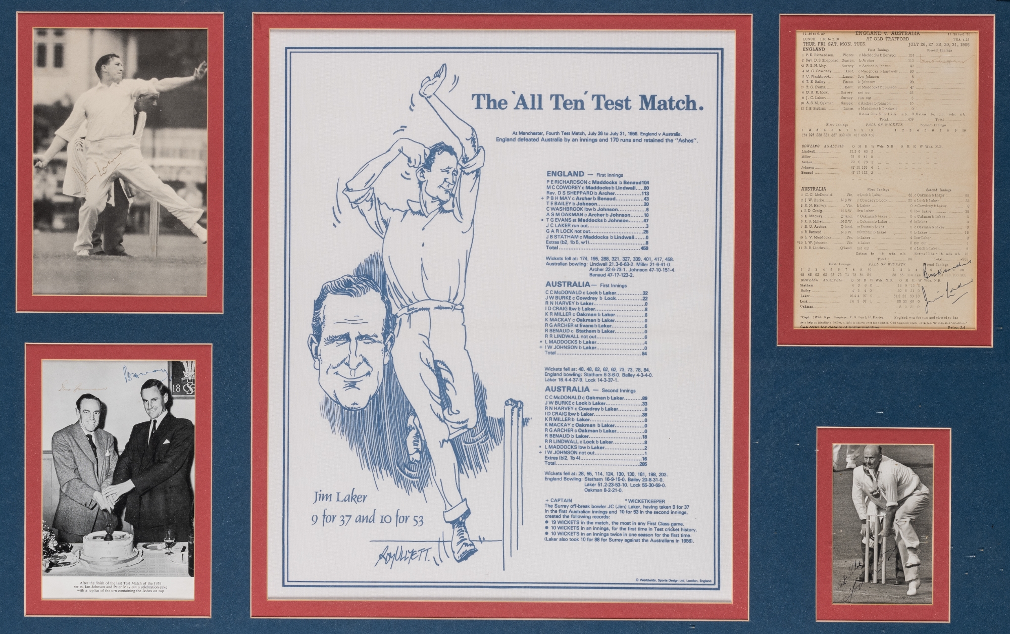 James Charles Laker "The All Ten Test Match" England v Australia 1956 cricket display, comprising a 8.5 by 5.5in. signed b & w action photographs of Jim Laker; a Ian Johnson and Peter May signed b & w image of them cutting a cake celebrating the finish of the last test match of 1956; a Roy Ullyett "The All Ten Test Match" illustrations of Jim Laker with legend of series, 48 by 39cm.; a Jim Laker signed score card and a b & w signed photograph of Tony Lock, mounted as one display, glazed and framed, overall 67 by 98cm. All glass will be removed from framed and glazed items prior to posting and may result in delays to shipping your items. (This service is included in the cost of postage and packing). We can also totally remove all framing and mounts upon request to reduce shipping costs. Alternatively lots can be collected in person by prior appointment from NN8 1RT.