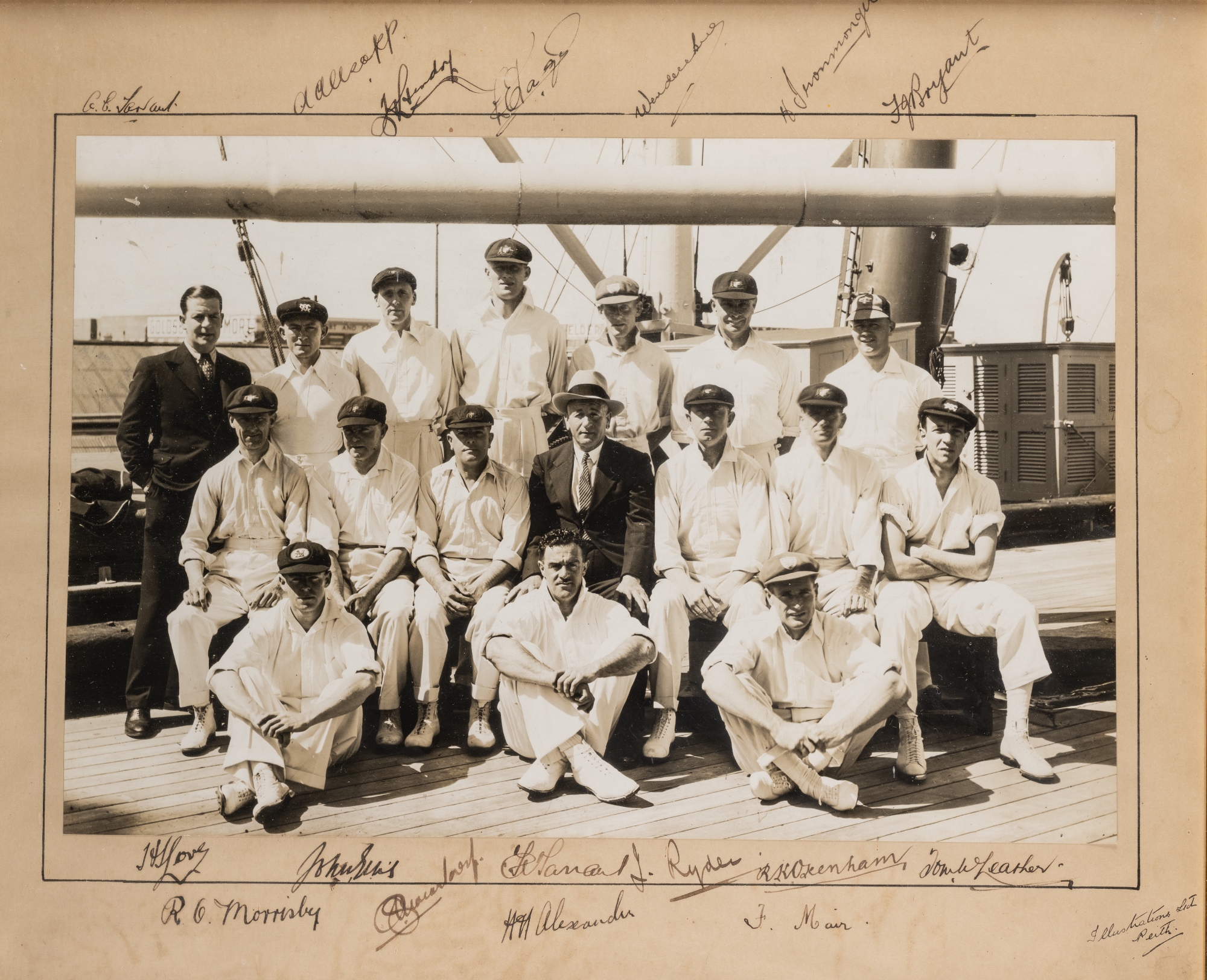 Signed photograph of the Australian cricket team to India and Ceylon, 1935-36, the rare sepia toned original 8 by 12 in. photograph portraying the team abroad the ship at the time of departure from Perth, signed in ink on surrounding mount by all 17 members of the party including Ryder (captain), MacCartney, Alexander, Hendry, Love, Nagel, Ironmonger, Oxenham, Tarrant and others, framed and glazed, overall 39 by 46cm. All glass will be removed from framed and glazed items prior to posting and may result in delays to shipping your items. (This service is included in the cost of postage and packing). We can also totally remove all framing and mounts upon request to reduce shipping costs. Alternatively lots can be collected in person by prior appointment from NN8 1RT.