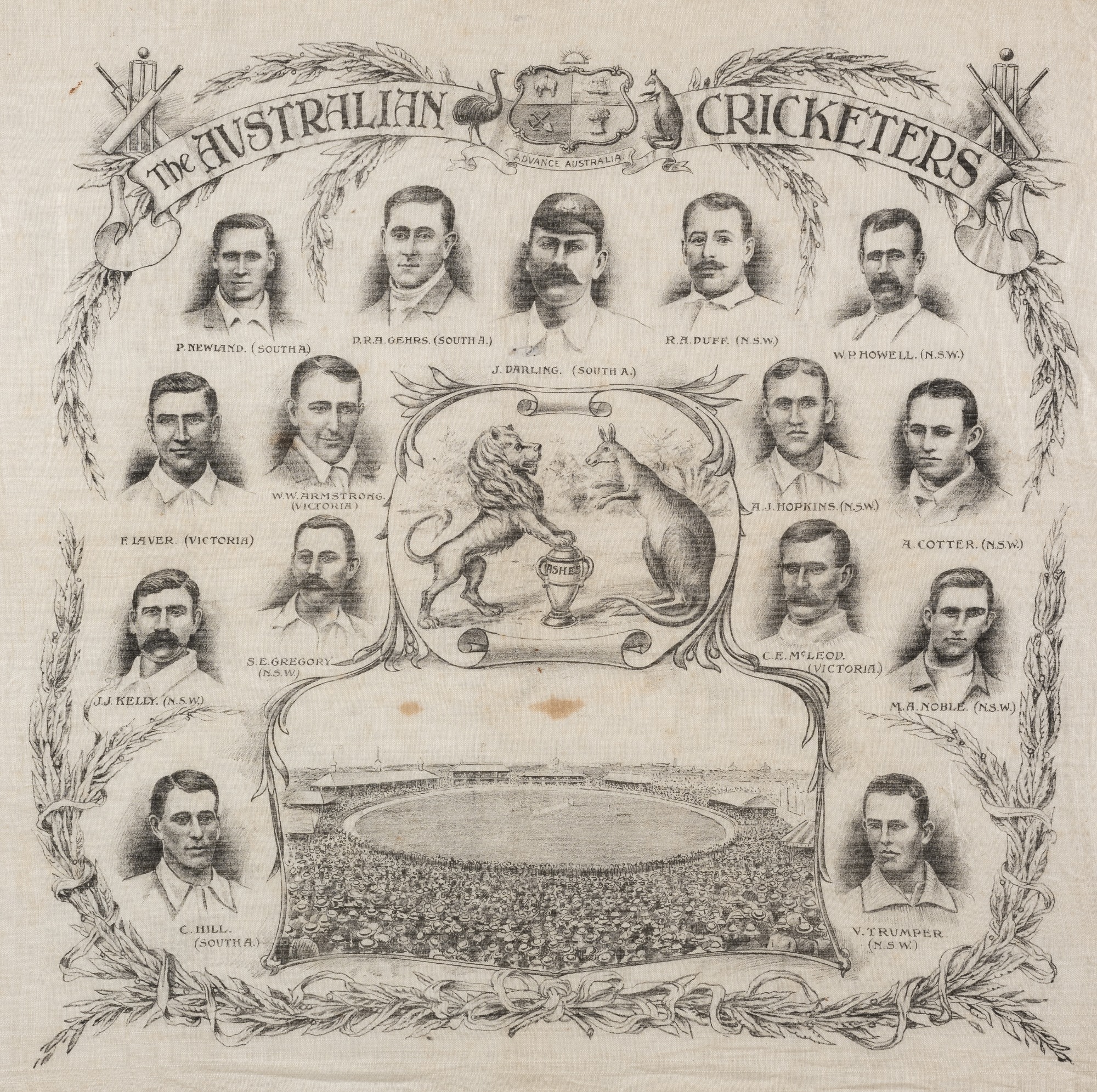 The Australian Cricketers "Ashes" linen handkerchief, circa 1905, featuring the national emblems of England and Australia, the Lion and the Kangaroo in the centre with the Ashes trophy, surrounded by individual player portraits of the Australian team, each printed with name and State, above an image of the Sydney cricket ground, the corners of the handkerchief featuring wicket, bats and ball, approximately 43 by 43cm., mounted, glazed and framed, overall 57 by 57cm., slight creasing and stains to the centre All glass will be removed from framed and glazed items prior to posting and may result in delays to shipping your items. (This service is included in the cost of postage and packing). We can also totally remove all framing and mounts upon request to reduce shipping costs. Alternatively lots can be collected in person by prior appointment from NN8 1RT.