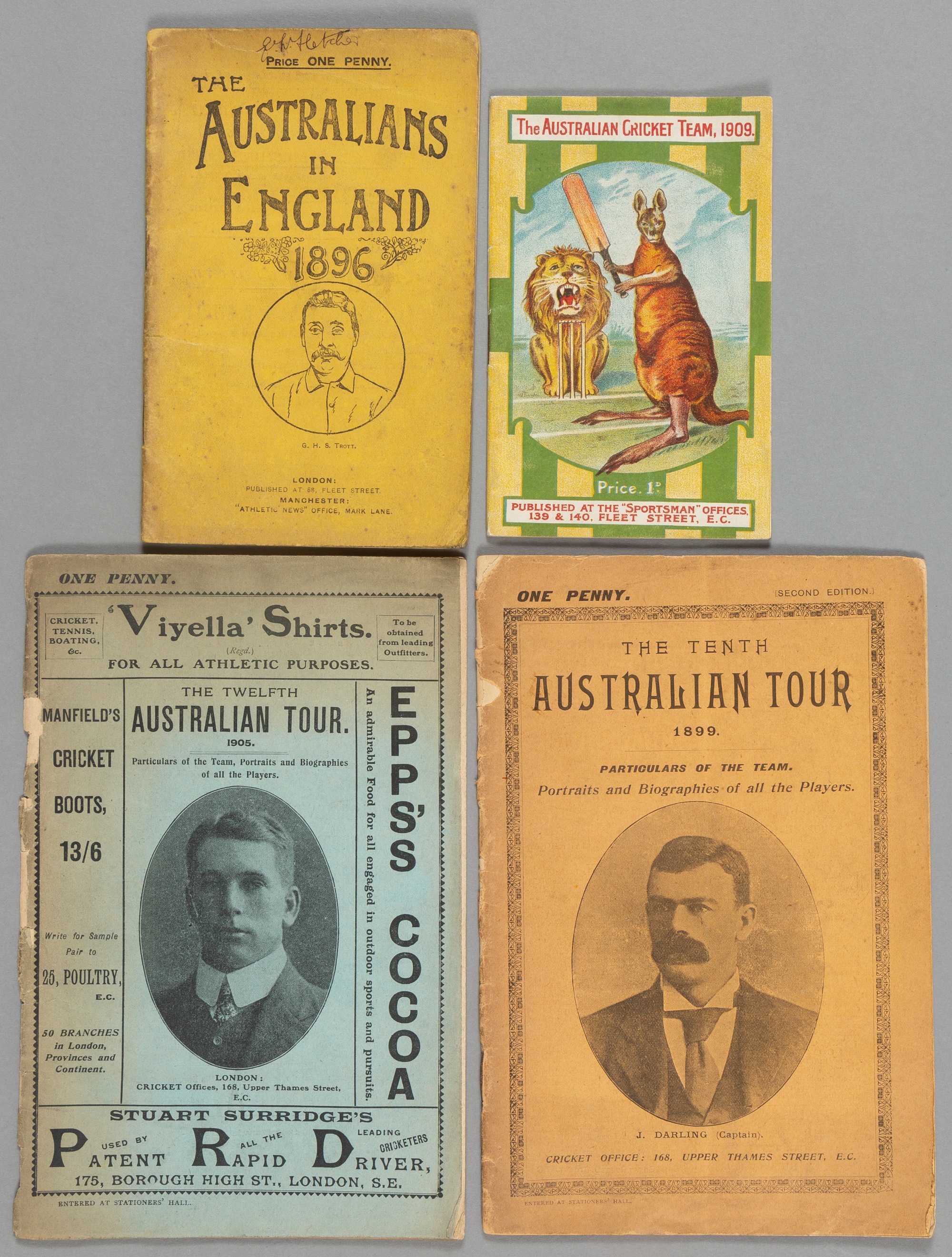 Four England v Australia Ashes cricket publications 1896 to 1909, The Australians in England 1896, good; The Tenth Australian Tour 1899, good; The Twelfth Australian Tour 1905, fragile but intact within protective wrappers; and The Australian Cricket Team 1909, good