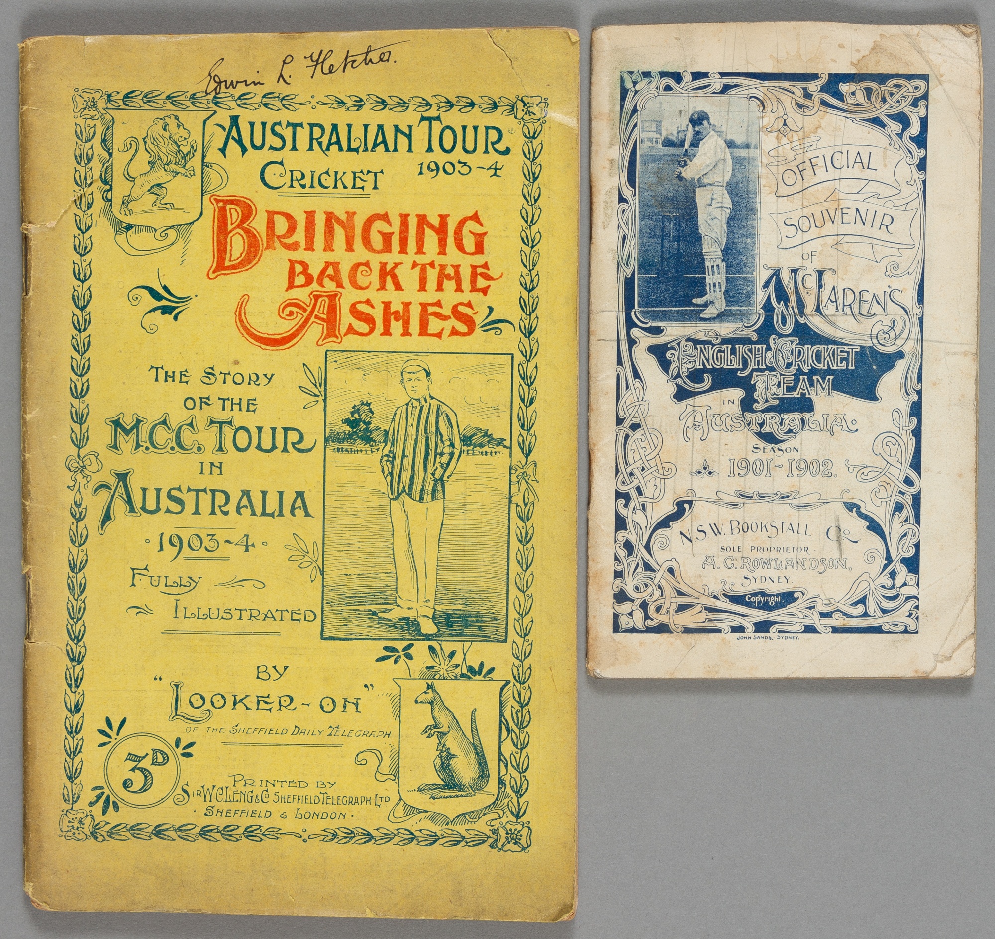 Official Souvenir of McLaren's English Cricket Team in Australia season 1901-1902, by J.C. Davis ("Not Out," Referee), 44 pages, illustrations, published by N.S.W. Bookstall Co., Sydney, some paper loss to back cover and the front cover bottom right, internally good; sold with Bringing Back The Ashes, The Story of the MCC Tour in Australia 1903-4, by "Looker On", published by the SHeffield Telegraph, 95 pages, illustrations, good (2)