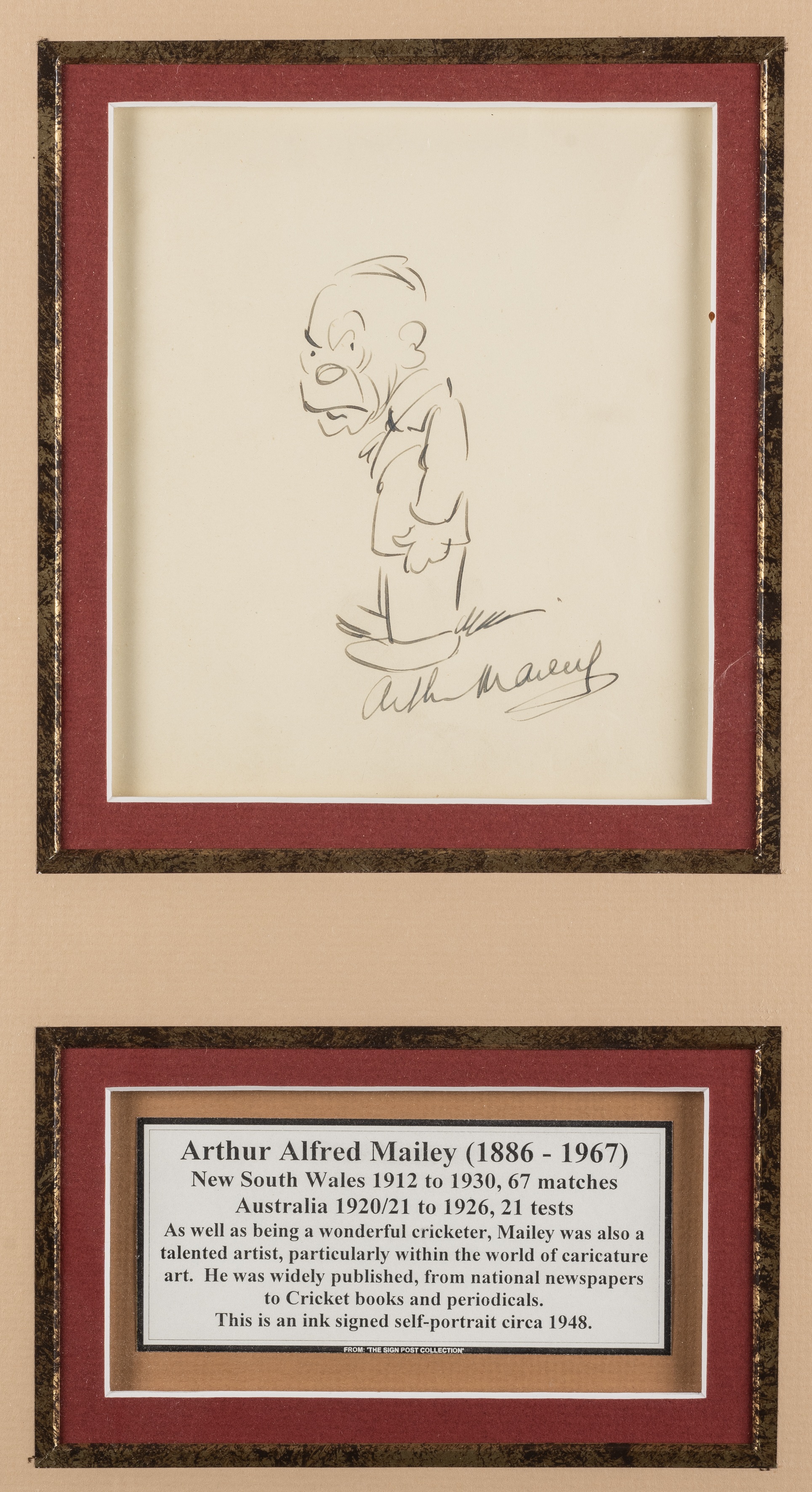 Arthur Alfred Mailey (Australian, 1886-1967) signed self portrait cricket caricature, circa 1948, pen and ink self portrait drawing on an album page, signed lower margin, mounted above a typed legend, glazed and framed, overall 46 by 31cm. All glass will be removed from framed and glazed items prior to posting and may result in delays to shipping your items. (This service is included in the cost of postage and packing). We can also totally remove all framing and mounts upon request to reduce shipping costs. Alternatively lots can be collected in person by prior appointment from NN8 1RT.