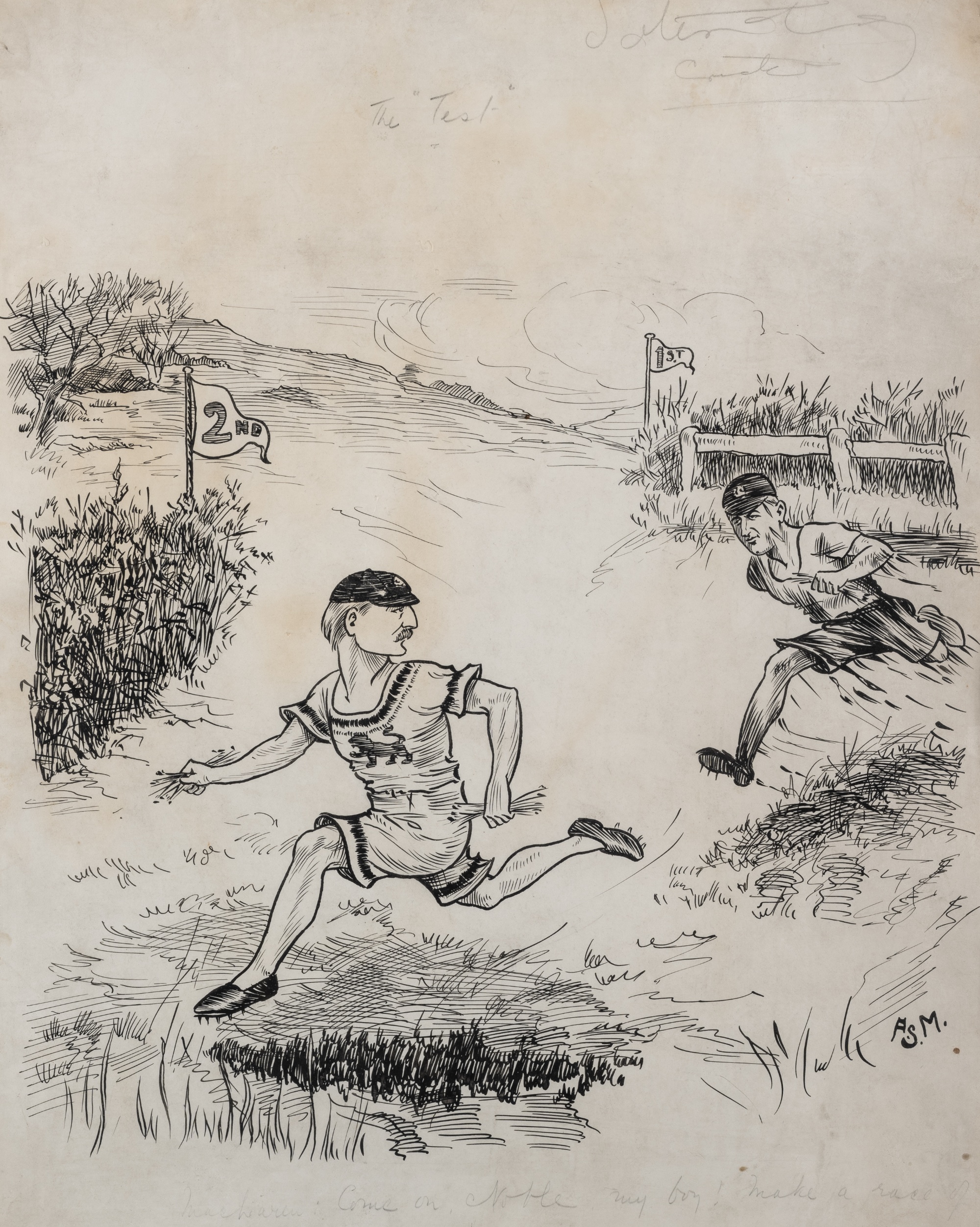 Original artwork for a cartoon featuring the England and Australia cricketers George Hirst and Monty Noble, and relating the 1903-04 Ashes series, signed by the artist A.S.M. titled "The Test" and captioned in pencil "Come on Noble my boy! Make a race of it", the image portraying the two cricketers competing in a cross-country steeplechase having passed the first and second markers (test matches), other inscriptions, pen and ink, the image 44 by 36cm., mounted framed and glazed, overall 62 by 52cm. England had won the first two test's of the Ashe's series, winning at Sydney by five wickets and in Melbourne by 185 runs, hence the cartoonist goading the Australian's. However you should be careful what you wish for as Australia responded by winning the third test at Adelaide by 216 runs, however England won an exciting series 3-2.