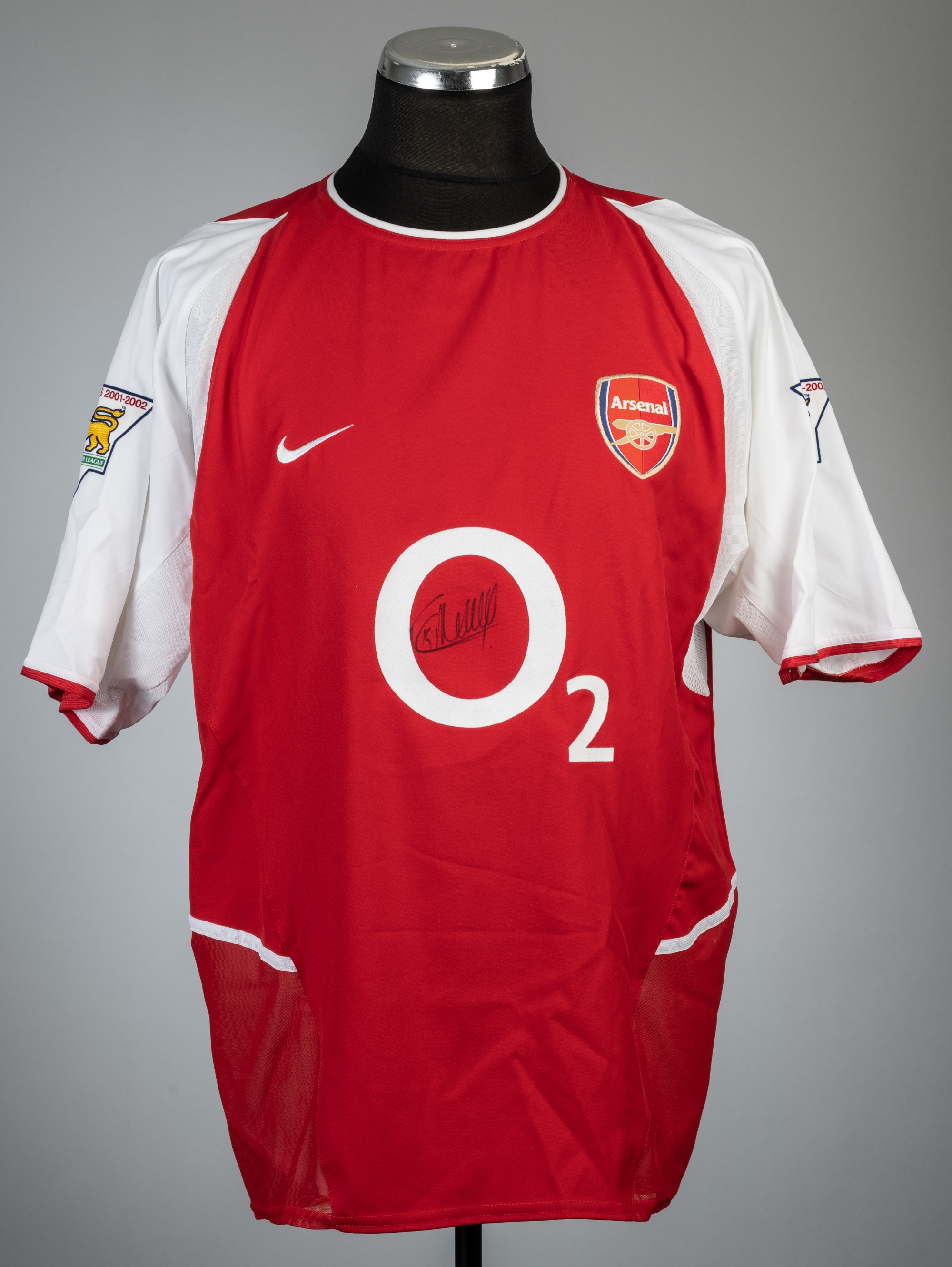 Thierry Henry signed red Arsenal no.14 home jersey, season 2002-03, Nike, short-sleeved with THE FA PREMIER LEAGUE CHAMPIONS 2001-2002 sleeve badges,