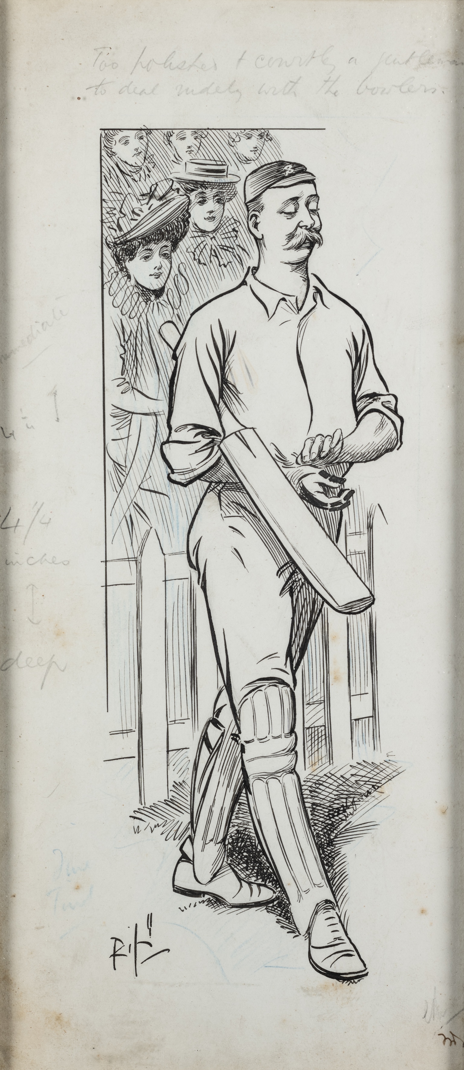 Original pen and ink drawing of a Cricketer, circa 1930s, depicting a cricketer with bat and crowd in the background, caption in pencil to upper margin "Too polished & courtly a gentleman to deal rudely with the bowlers" and measurements in pencil to left margin, signed by artist lower left margin "Rip" possibly for Ronald Petty Hill, London Evening News cartoonist, glazed and framed, overall 34 by 17cm. All glass will be removed from framed and glazed items prior to posting and may result in delays to shipping your items. (This service is included in the cost of postage and packing). We can also totally remove all framing and mounts upon request to reduce shipping costs. Alternatively lots can be collected in person by prior appointment from NN8 1RT.