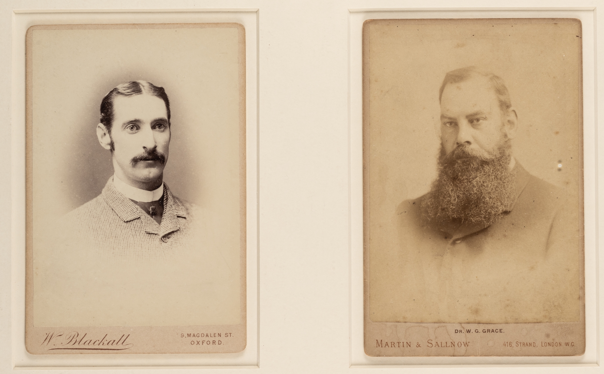Two cabinet cards of the famous cricketers Dr W.G. Grace and Fred Spofforth, circa 1885, the first published by Martin & Sallnow, London, the second by W Blackall, Oxford, 6.5 by 4.5 in. mounted photographs portraying the two greatest symbols of England and Australian cricket in Victorian times, mounted, framed and glazed All glass will be removed from framed and glazed items prior to posting and may result in delays to shipping your items. (This service is included in the cost of postage and packing). We can also totally remove all framing and mounts upon request to reduce shipping costs. Alternatively lots can be collected in person by prior appointment from NN8 1RT.