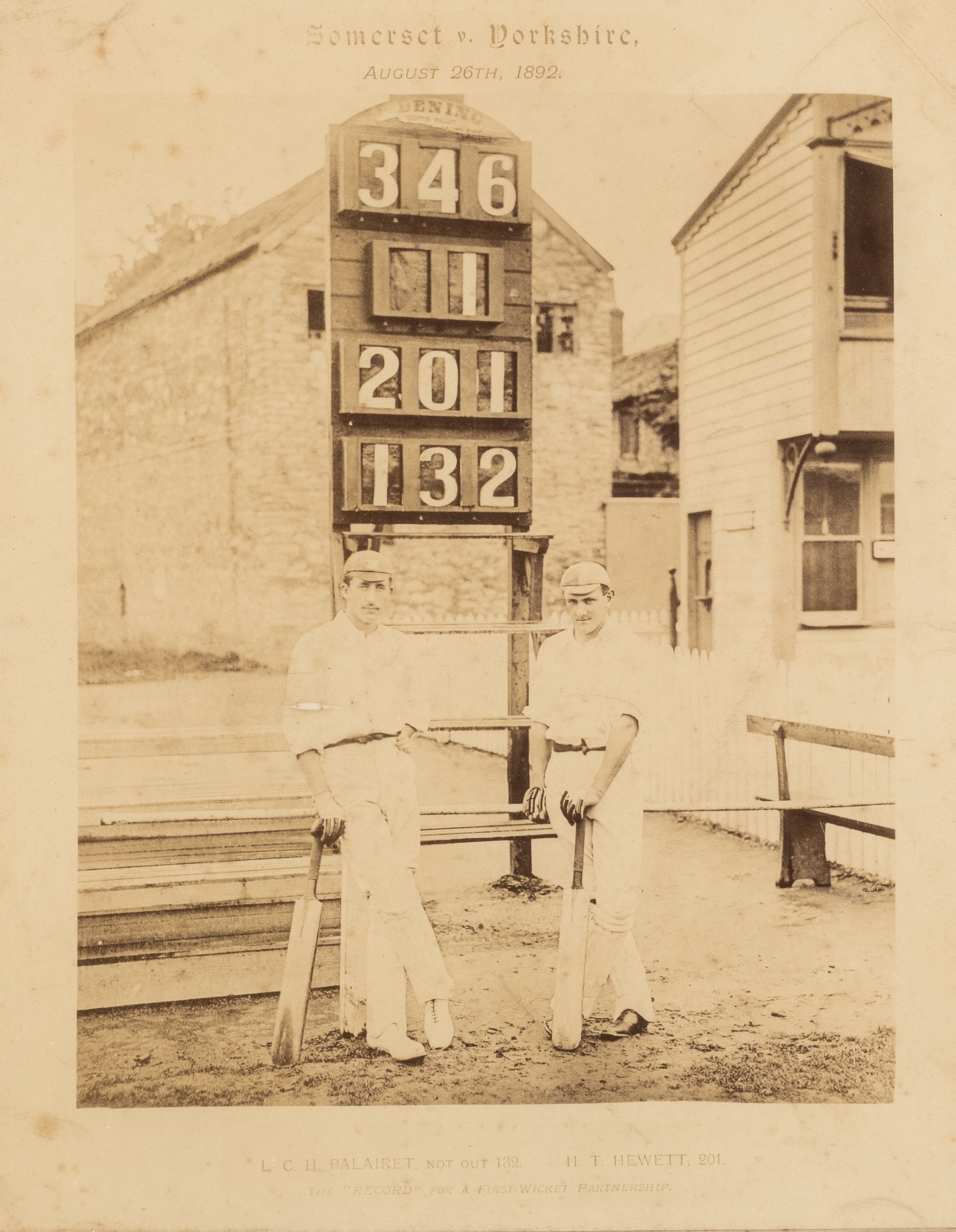 An original sepia toned photograph portraying L.C.H Palairet and H.T Hewett standing in front of the scoreboard on the occasion of their record, first wicket partnership of 346 for Somerset v Yorkshire, at Taunton, 26th August 1892, 11.5 by 9.5 in. photograph, mounted, glazed and framed, overall 50 by 44cm. All glass will be removed from framed and glazed items prior to posting and may result in delays to shipping your items. (This service is included in the cost of postage and packing). We can also totally remove all framing and mounts upon request to reduce shipping costs. Alternatively lots can be collected in person by prior appointment from NN8 1RT.