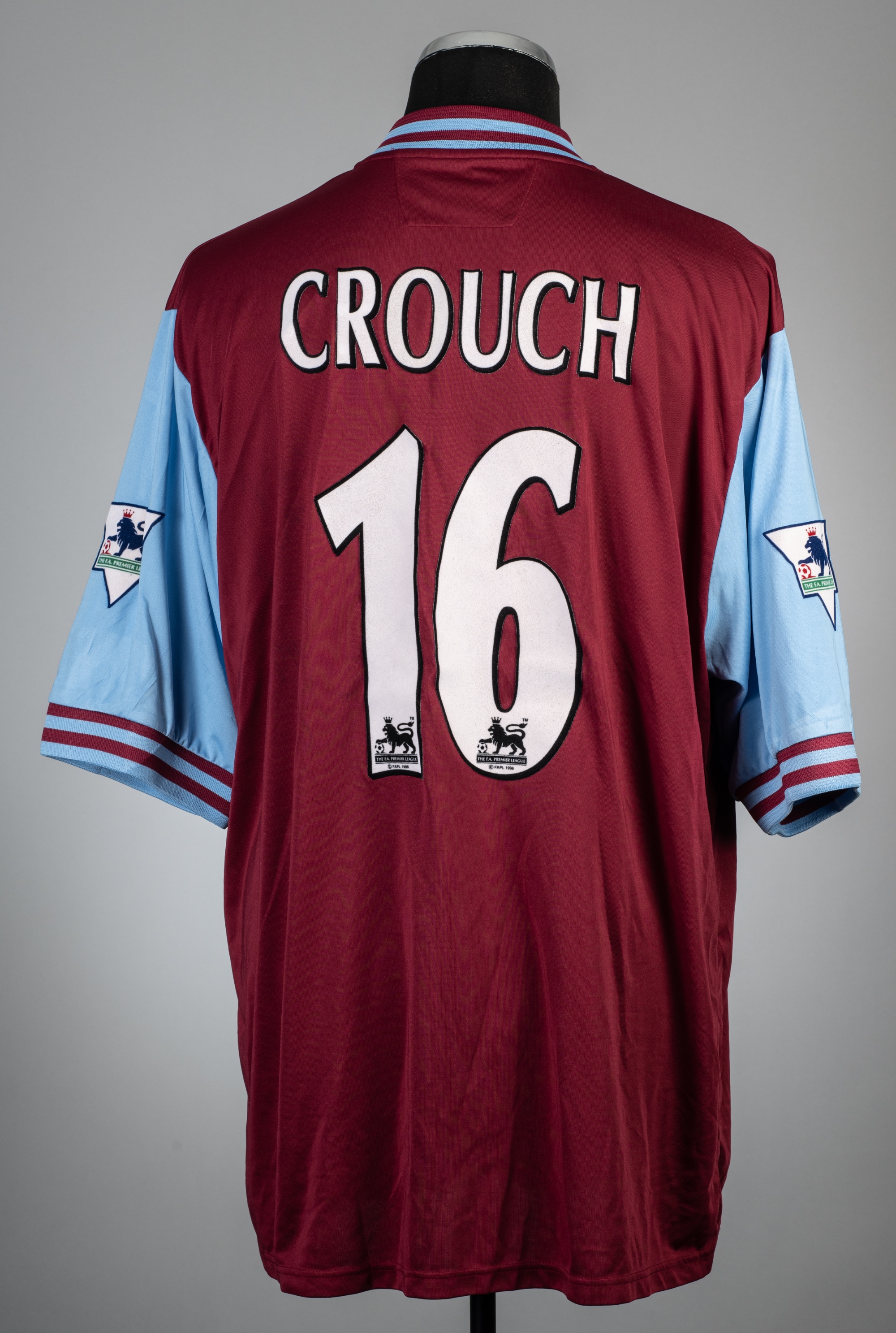 Peter Crouch claret and blue Aston Villa no.16 home jersey, season 2002-03, Diadora, short-sleeved with FA PREMIER LEAGUE sleeve badges, club crest badge, and sponsor logo, reverse lettered CROUCH, size 50/52in.