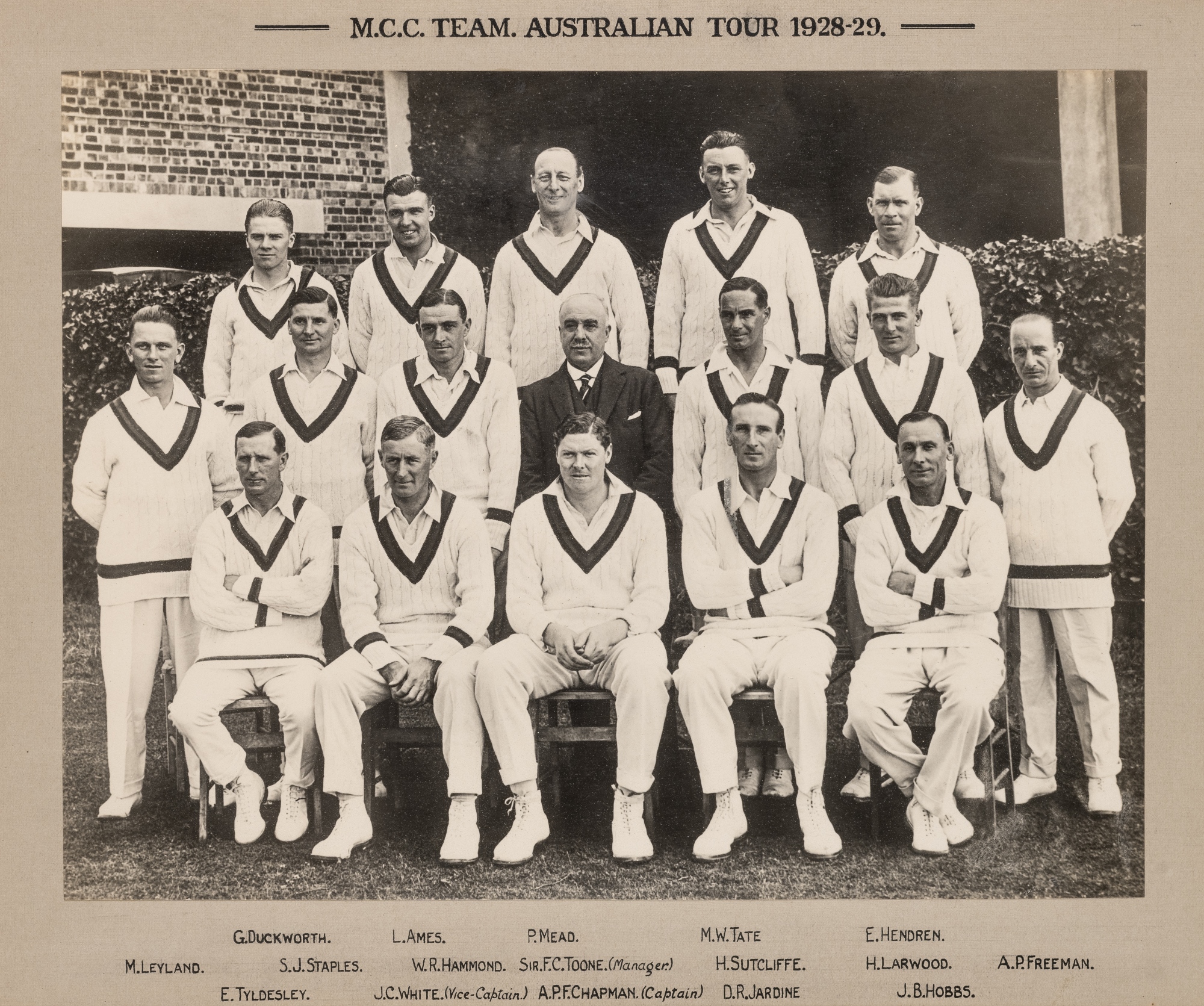 An official photograph of the MCC 1928-29 Touring Team to Australia, 20 by 27cm., 8 by 10 1/2in. b&w team-group photograph with manuscript title and