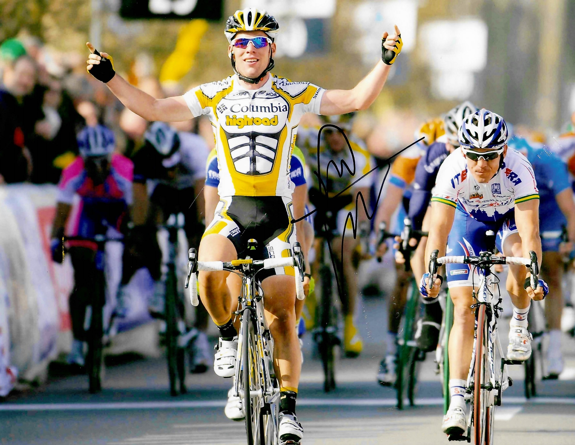 Tour de France Collection of signed memorabilia, including Chris Froome OBE signed 8 by 12in. photograph (2013, 2015, 2016, 2017 Tour de France Champion), Cadel Evans signed 8 by 10in. photograph (2011 Tour de France Champion), Mark Cavendish signed 8 by 10in. photograph (2011 & 2021 Points Classification Winner) and Mark Cavendish signed book (Tour de Force – 2022), with COA and photo proof, (4)