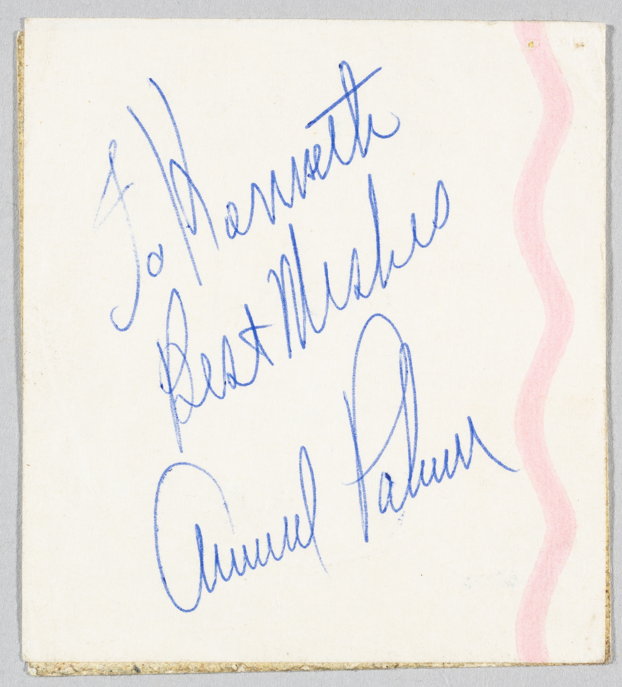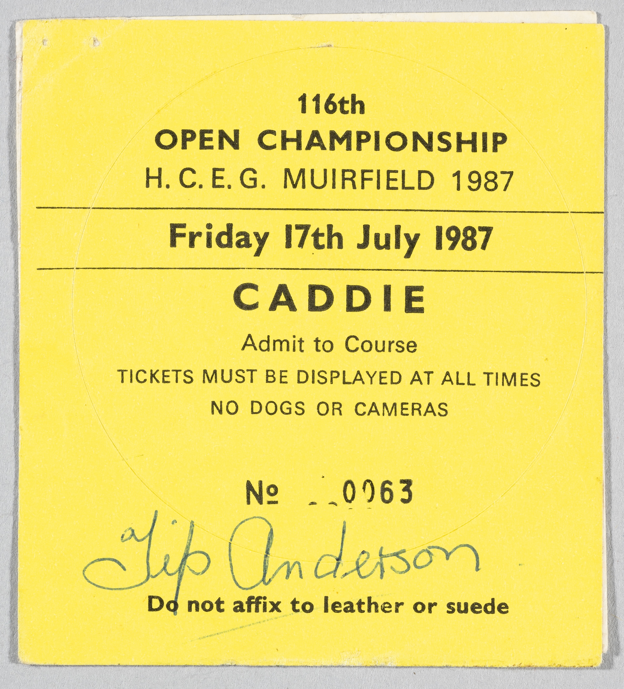 Tip Anderson and Arnold Palmer signed Muirfield 1987 Open Championship golfer's caddie's badge, the yellow sticker badge printed 116TH OPEN CHAMPIONSHIP H.C.E.G. MUIRFIELD 1987, FRIDAY 17TH JULY 1987, CADDIE, ADMIT TO COURSE, NO.0063, signed by Tip Anderson in blue ink, reverse sticker backing signed and dedicated by Arnold Palmer TO KENNETH BEST WISHES ARNOLD PALMER, 8 by 7cm.