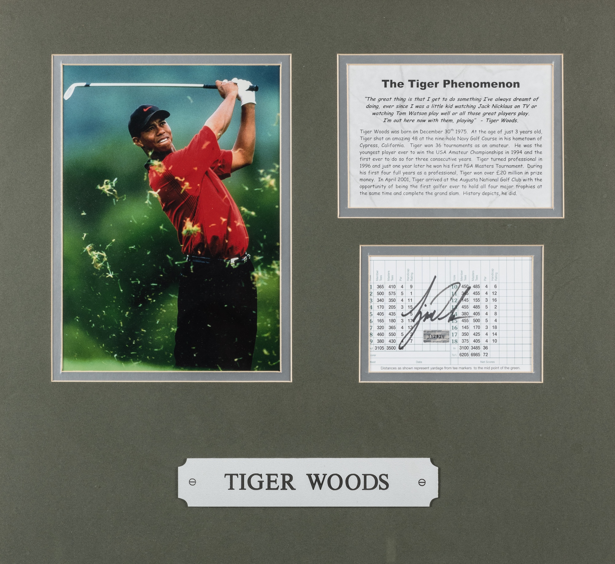 Tiger Woods 2001 Augusta National golf display, featuring a 11 by 8in. colour action photograph of Tiger Woods mounted beside a signed Augusta Nation