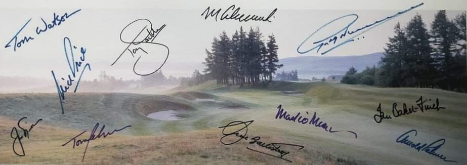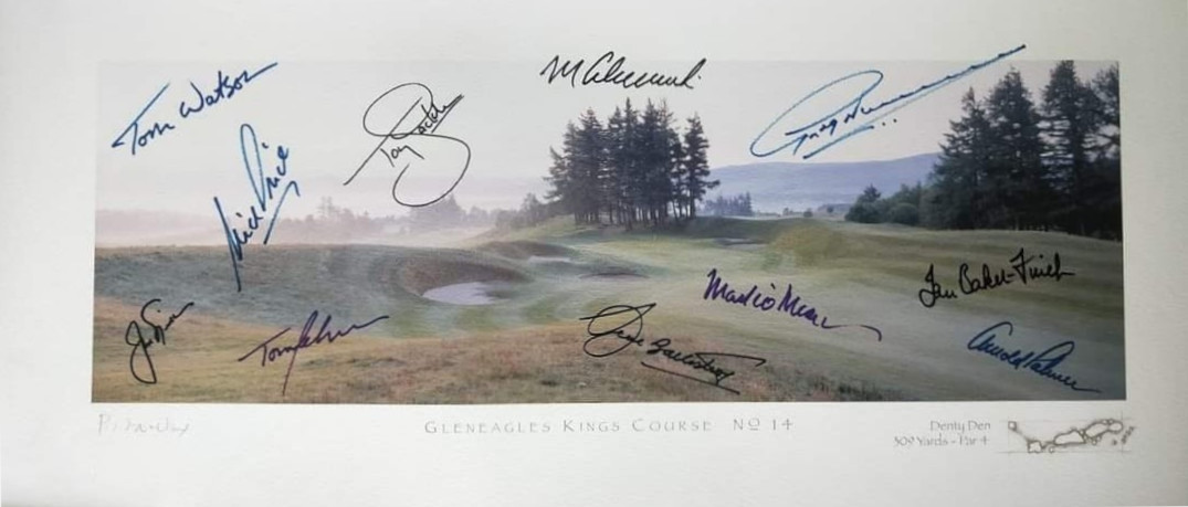 Golf – Gleneagles Kings Course Denty Den 309 yards Par 4 No.14 print by artist Patrick Drickey, superb image signed by 11 PGA golf legends and Major Winners including Jack Nicklaus, Arnold Palmer, Tom Watson, Seve Ballesteros, Greg Norman, Tony Jacklin, Nick Price, Ian Baker Finch, Mark O'Meara, Mark Calcavecchia and Tom Lehman, measures 61 by 30cm., originally the property of Dermot Reeve ex England & Warwickshire cricketer, has accompanying letter stating how he came by it from ex golf coaching pro David Wright