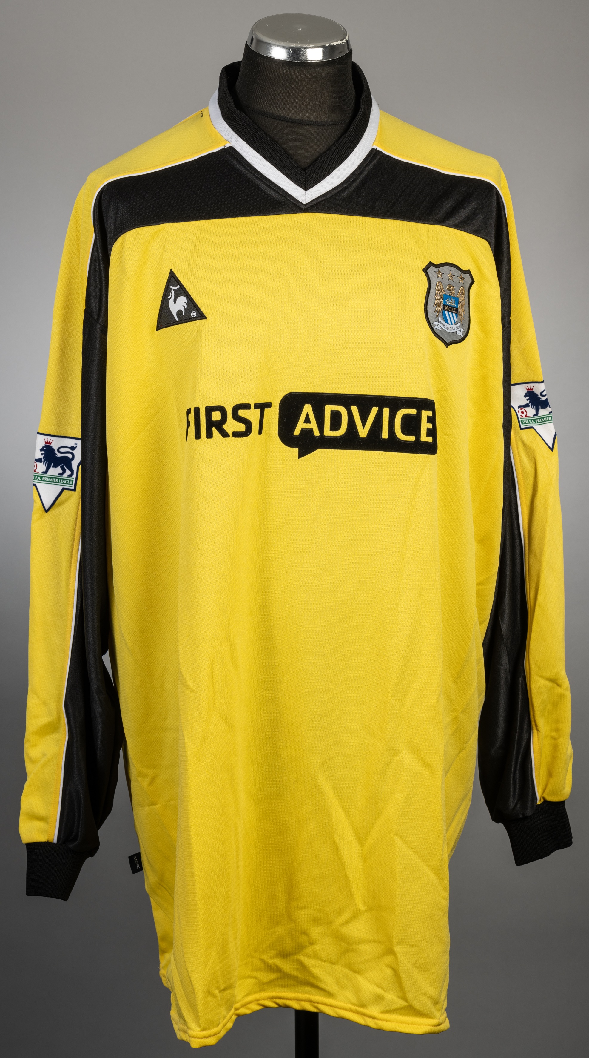 Peter Schmeichel yellow and black Manchester City no.1 goalkeeper's jersey, season 2002-03, Le Coq Sportif, long-sleeve with THE FA PREMIER LEAGUE sl