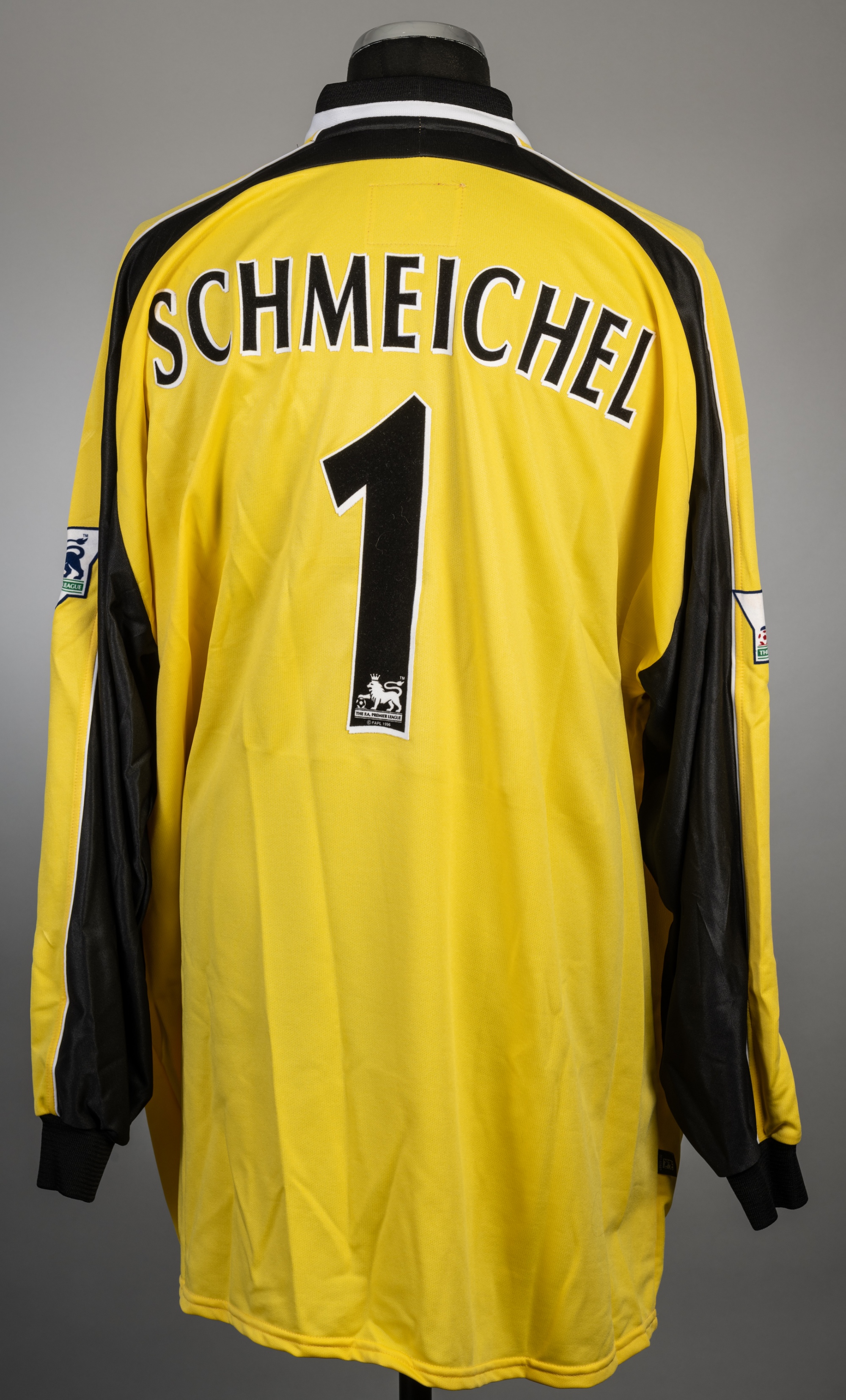 Peter Schmeichel yellow and black Manchester City no.1 goalkeeper's jersey, season 2002-03, Le Coq Sportif, long-sleeve with THE FA PREMIER LEAGUE sleeve badges, club crest and sponsor logo, reverse lettered SCHMEICHEL, size 54/56in.