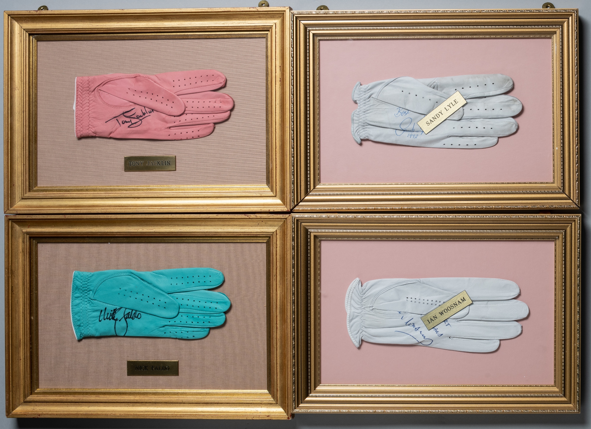 Four British Major winner's signed golf gloves, each glove mounted, glazed and framed with engraved players name, signed in blue pen and black marker pen, players include Ian Woosnam and Sandy Lyle on white gloves, Tony Jacklin on pink glove and Nick Faldo on green glove, 26 by 37.5cm, (4) All glass will be removed from framed and glazed items prior to posting and may result in delays to shipping your items. (This service is included in the cost of postage and packing). We can also totally remove all framing and mounts upon request to reduce shipping costs. Alternatively lots can be collected in person by prior appointment from NN8 1RT.