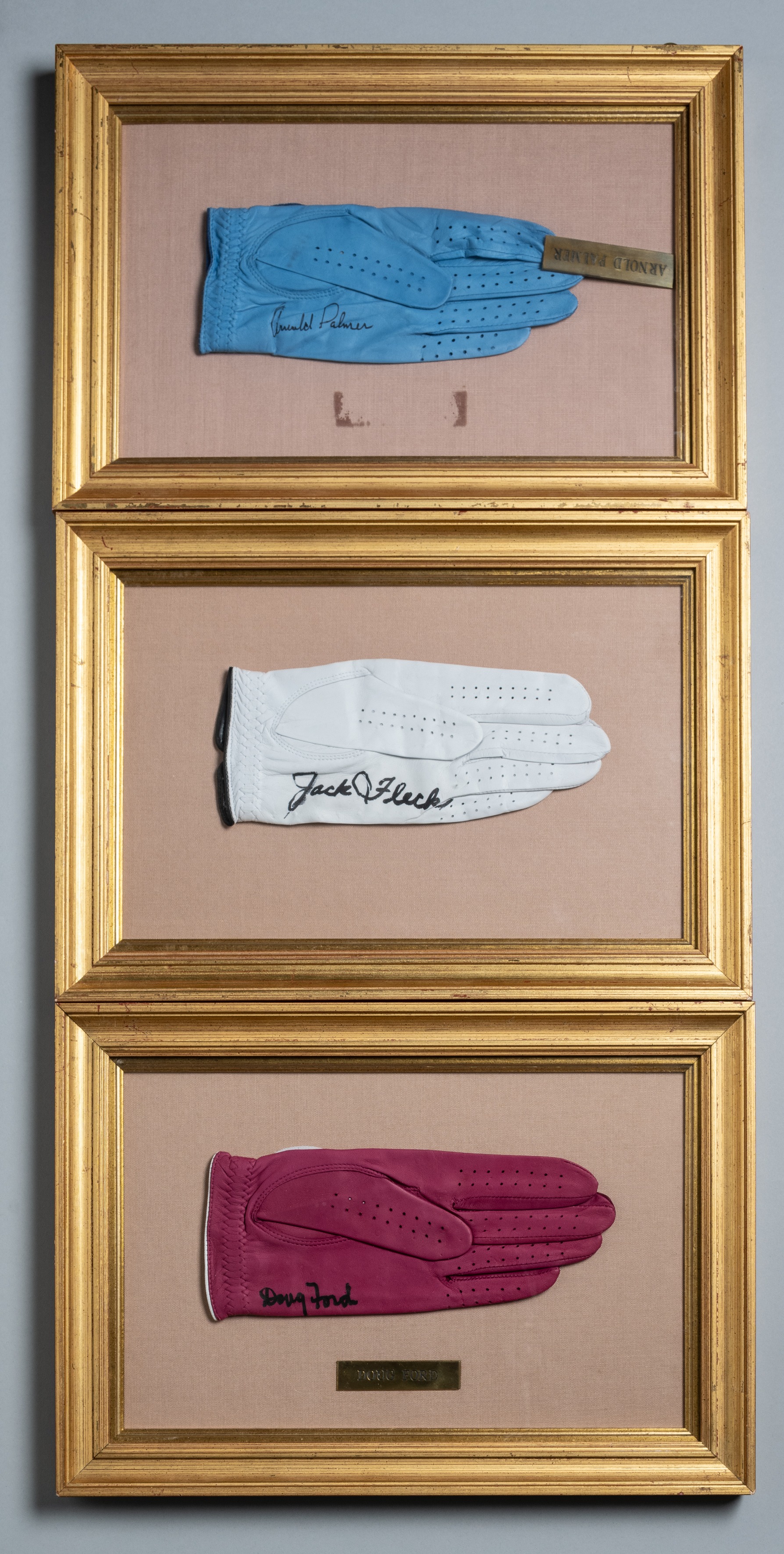 Three US Major winner's born in the 1920s signed golf gloves, each glove mounted, glazed and framed with engraved players name, signed in black marker pen, players include Jack Fleck on a white glove, Doug Ford on a pink glove and Arnold Palmer on a blue glove, 26 by 37.5cm, (3) All glass will be removed from framed and glazed items prior to posting and may result in delays to shipping your items. (This service is included in the cost of postage and packing). We can also totally remove all framing and mounts upon request to reduce shipping costs. Alternatively lots can be collected in person by prior appointment from NN8 1RT.