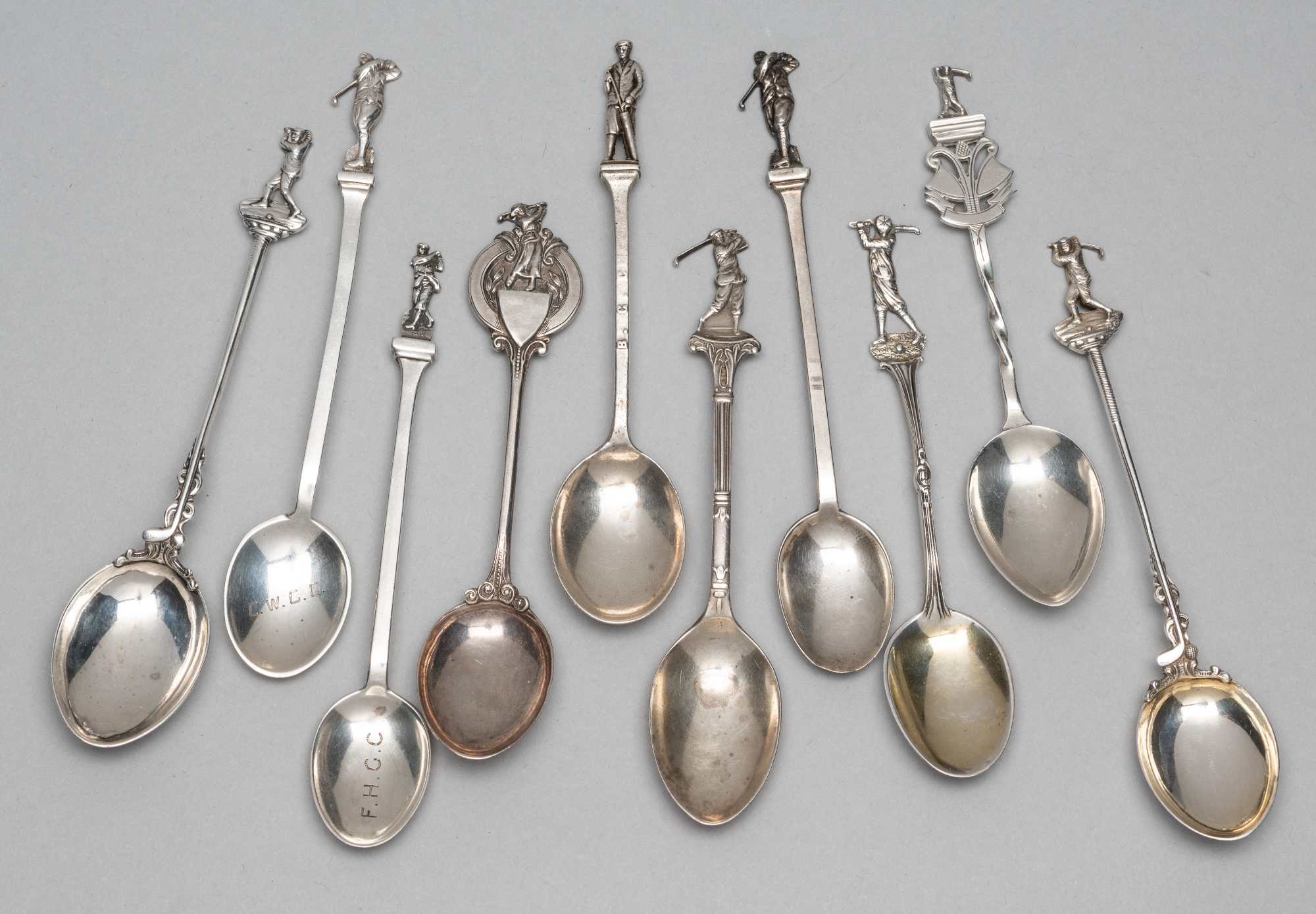 Ten various silver hallmarked golf prize spoons, dating from 1912 (all pre-WWII), all with golfing figure finials and several with golf club initials, total silver weight 127gms., (10)