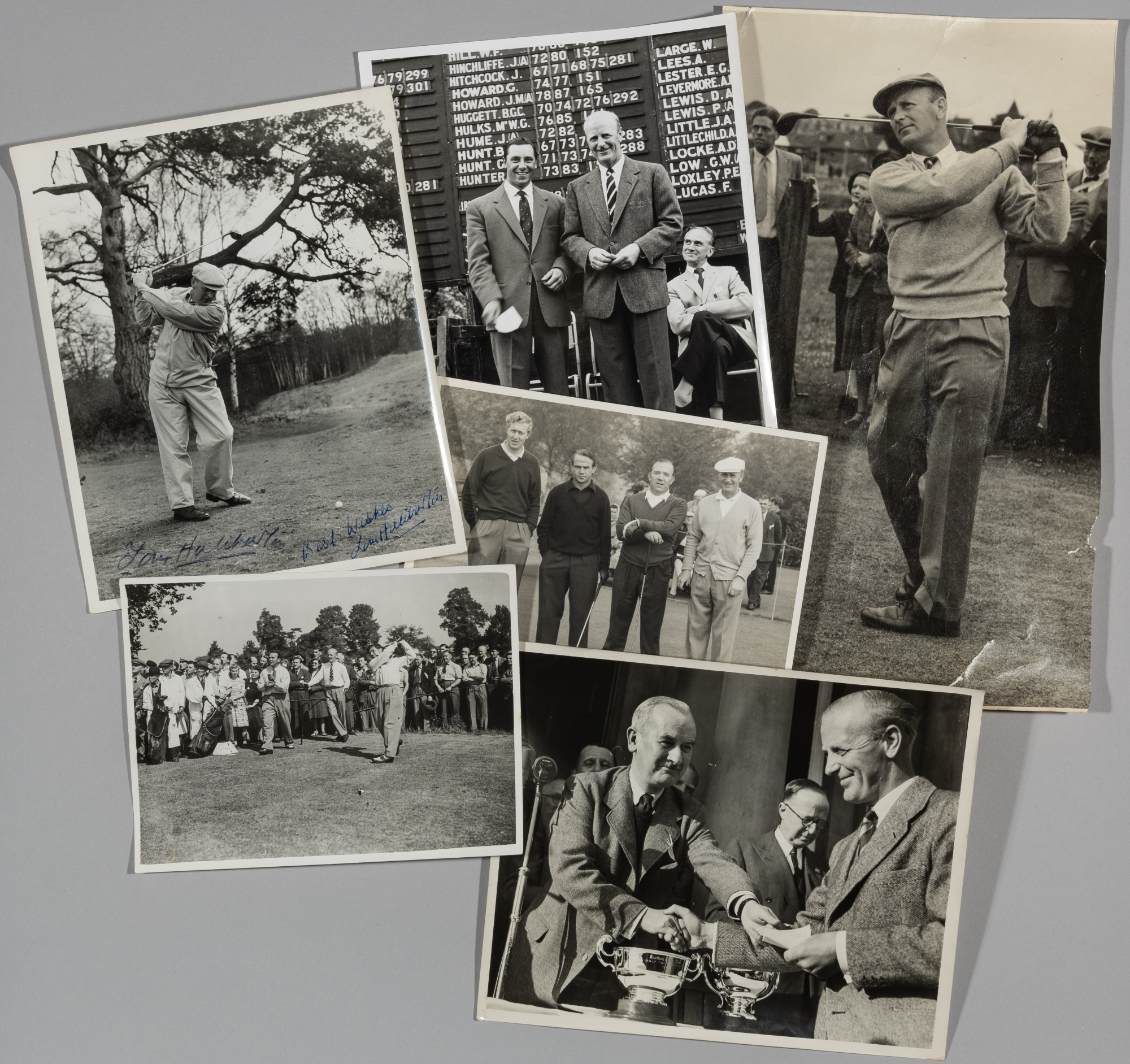 Collection of b&w photographs relating to the golfer Tom Haliburton, including a signed photograph of Tom Haliburton taking a swing, team and action photographs from tournaments, formal dinner and presentations, individual action photographs including one from his 1941 RAF airmen's P.T.I. course, (qty)